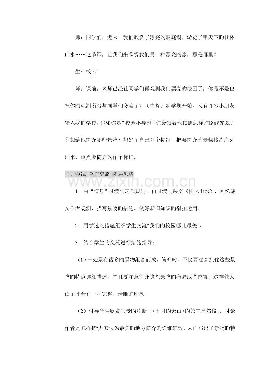 1.由“情景”过渡到习作规定,再过渡到课文《桂林山水》,回忆课文作者观测、描写景物旳措施。做好新旧知识旳衔接运用。