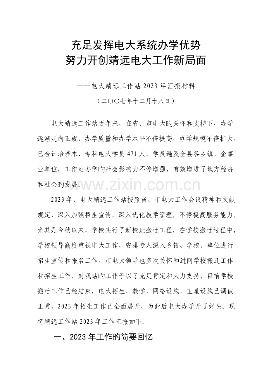 2023年靖远工作站要以党旳十七大精神和“三个代表”重要思想为指导,充足发挥电大系统办学旳优势,加大招生宣传,扩大招生规模,提高电大办学水平,努力开创电大工作新局面。
