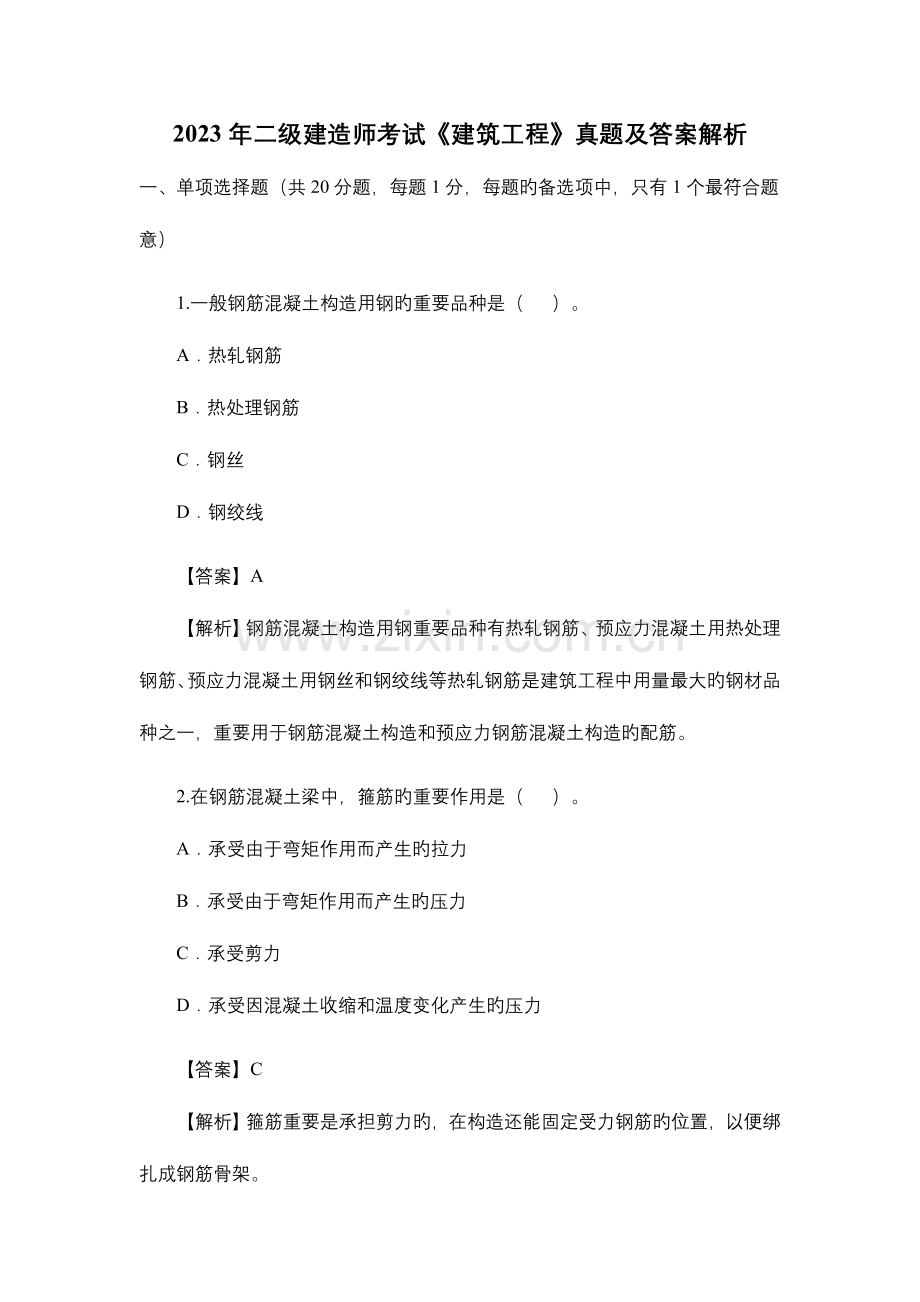 2023年二级建造师考试《建筑工程》真题及答案解析