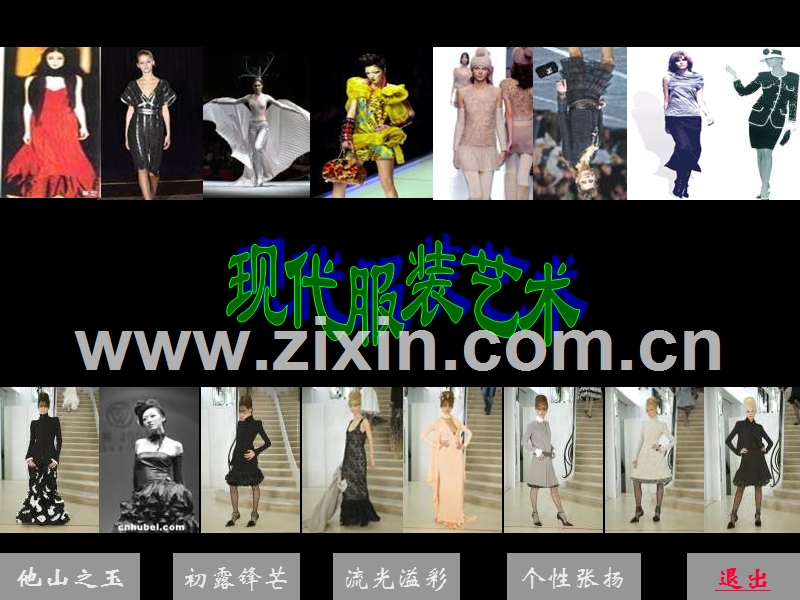 现代服装艺术,退出,他山之玉,个性张扬,初露锋芒,流光溢彩,,,,,,服,饰,的,审,美,要,素,,,纹,饰,,,款,式,,,,用纯度比较高的暖色来表现热情,色彩,用冷色表达含蓄,色彩,用柔和的中性色表达幽雅的气质,色彩,,结合你本人的爱好和自身的气质与肤色你认为你最适合什么颜色,?,纹饰,纹饰,纹饰,,用纱表现轻柔飘逸,面料,用裘皮表达雍容,面料,用亚麻表现闲适、恬静的气质,面料,用金属亮片装饰的晚礼服可以营造梦幻般的气氛,面料,,款式,,服饰的审美要素,色彩,纹饰,面料,款式,年龄,性别,气质,职业,身材,时间,地点,结合实际生活你认为在服装的穿着和搭配上应注意哪些,?,1.服装尺寸要合体,2.服装款式要大方,3.服装配色要协调,4.穿着要适时,5.穿着要注意场合,,,我们的舞台,时代的发展使服装有了丰富的变化,面对五花八门的服装,同学们不要求奇、求怪、求名牌,而要正确地对待服饰美通过和谐的服饰和整洁的仪表,来塑造良好的性格、形象才是我们这节课学习的真正目的。,小论文:怎样看待流行服?,作业:,