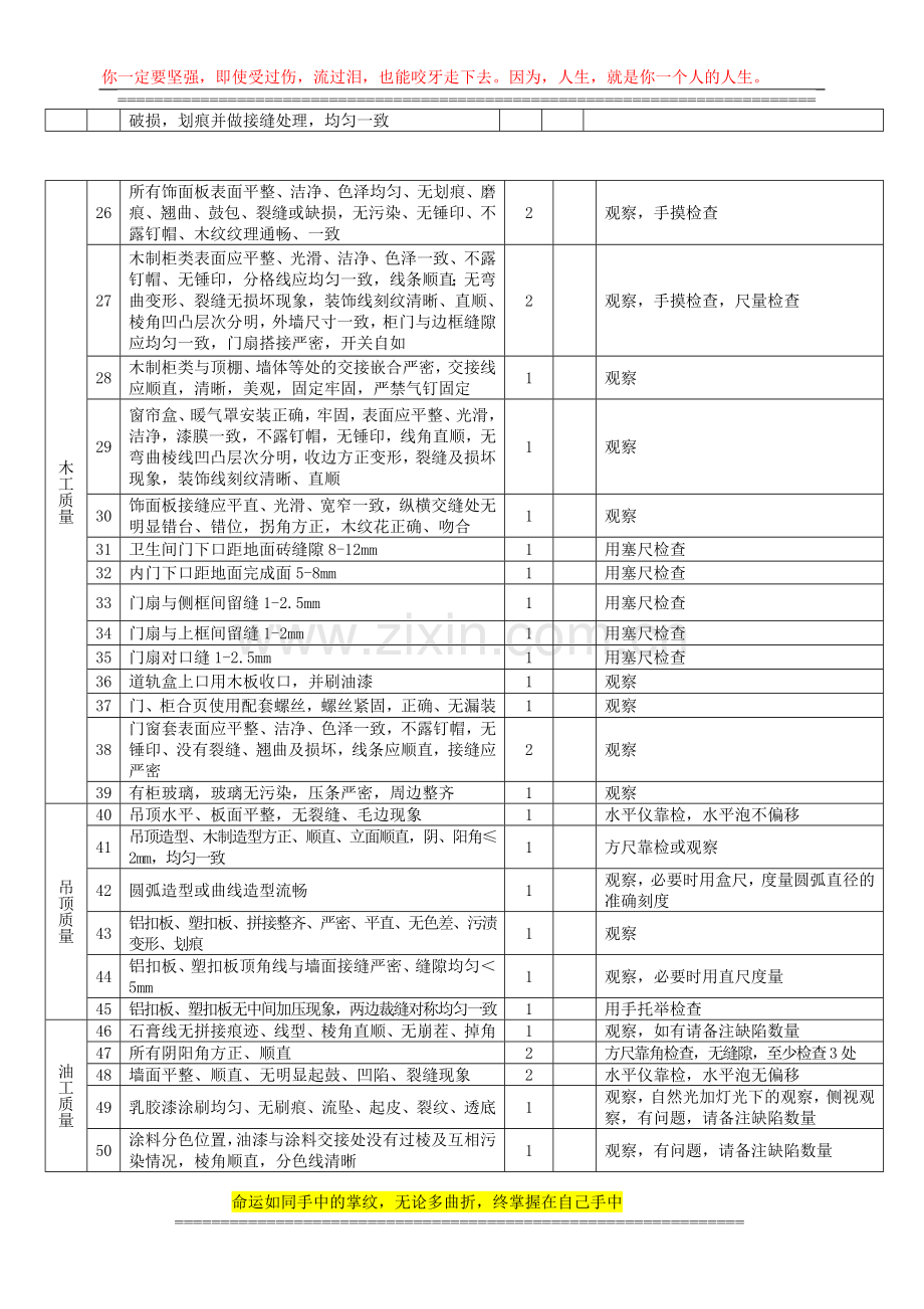 评分标准:1.质量评定员按照此表项目检查;2.总分100分,每出现一处不符合要求的,按照相应分值扣分,同一项目发现多处不符合要求的,进行累计扣分,扣完为止。