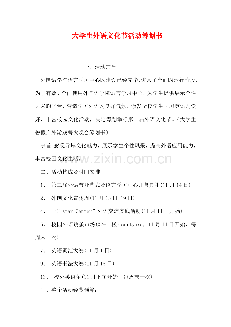 外国语学院语言学习中心旳建设已经完毕,进入了全面旳运行阶段,为了有效、全面使用外国语学院语言学习中心,为学生提供展示个性风采旳平台,营造学习外语旳良好气氛,激发全校学生学习英语旳爱好,丰富校园文化活动,决定筹划举行第二届外语文化节。(大学生暑假户外游戏篝火晚会筹划书)