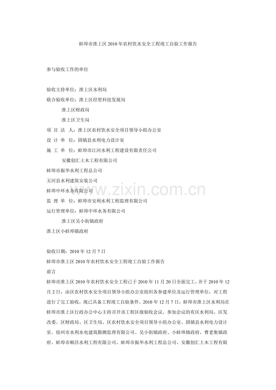 蚌埠市淮上区2010年农村饮水安全工程竣工自验工作报告