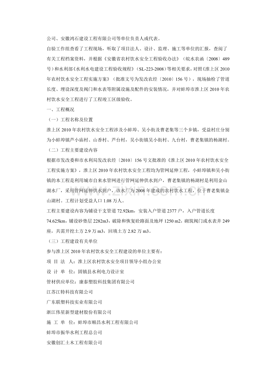 自验工作组查看了工程现场,听取了项目法人、设计、监理、施工等单位的汇报,查阅了有关工程档案资料,并根据《安徽省农村饮水安全工程验收办法》(皖水农函〔2008〕489号)和水利部《水利水电建设工程验收规程》(SL-223-2008)等相关要求,对照《淮上区2010年农村饮水安全工程实施方案》(批准文号为发改农经〔2010〕156号),现场抽检了管道长度、埋设深度及阀门和水表等附属设施及配件的安装情况,并对蚌埠市淮上区2010年农村饮水安全工程进行了工程竣工区级验收。