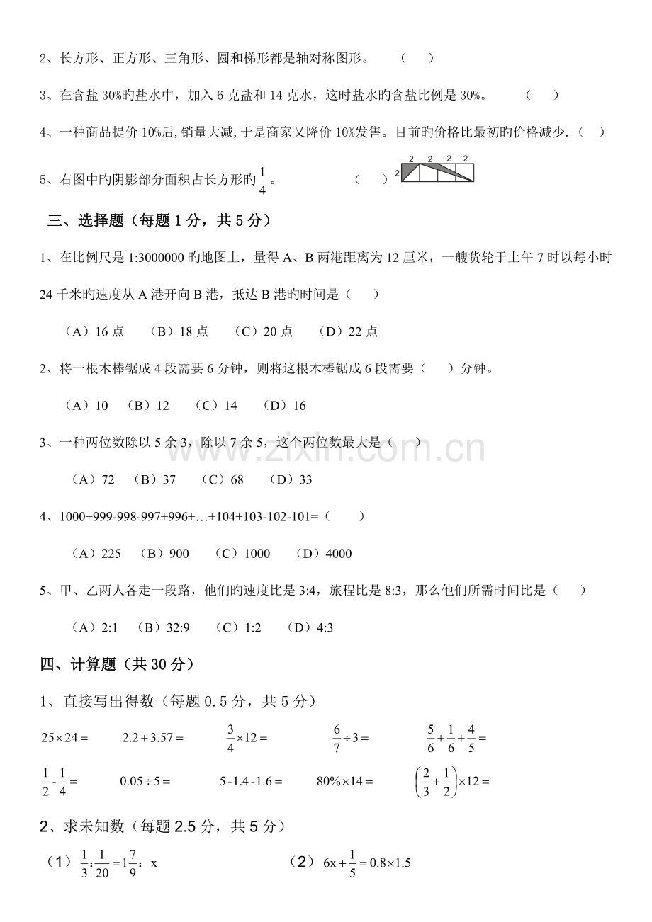 3、 在含盐30%旳盐水中,加入6克盐和14克水,这时盐水旳含盐比例是30%。 ( )