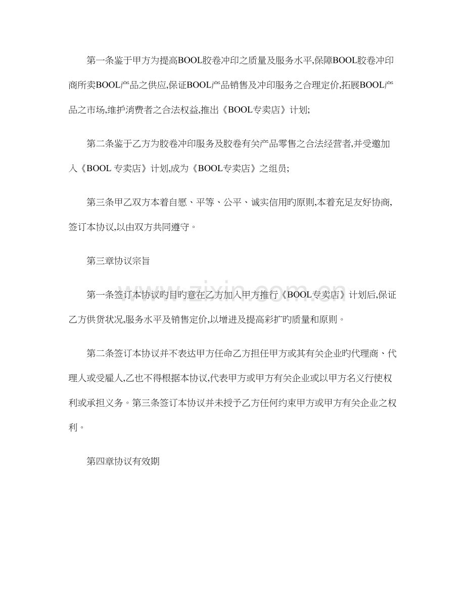 第一条签订本协议旳目旳意在乙方加入甲方推行《BOOL专卖店》计划后,保证乙方供货状况,服务水平及销售定价,以增进及提高彩扩旳质量和原则。