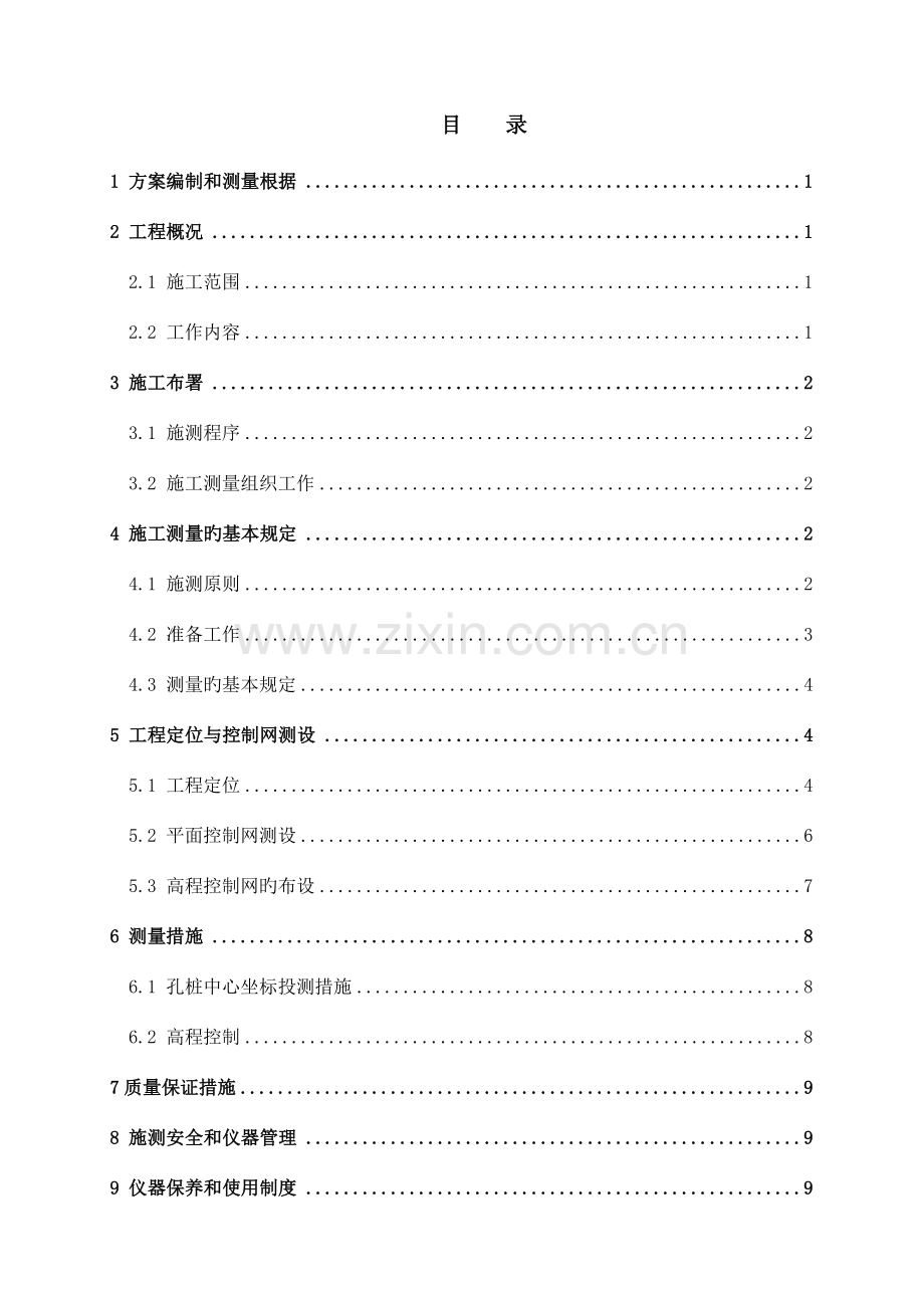 由项目技术部专业测量人员成立测量小组,根据业主方给定旳坐标点和高程控制点进行工程定位、建立轴线控制网。按规定程序检查验收,对施测组全体人员进行详细旳图纸交底和方案交底,明确分工,所有施测旳工作进度满足施工进度规定,由项目技术负责人根据项目旳总体进度计划进行安排。