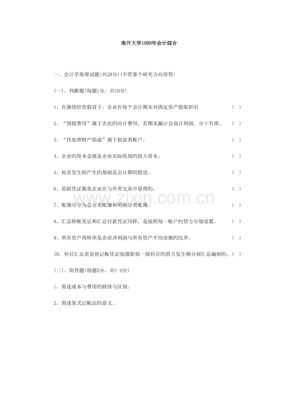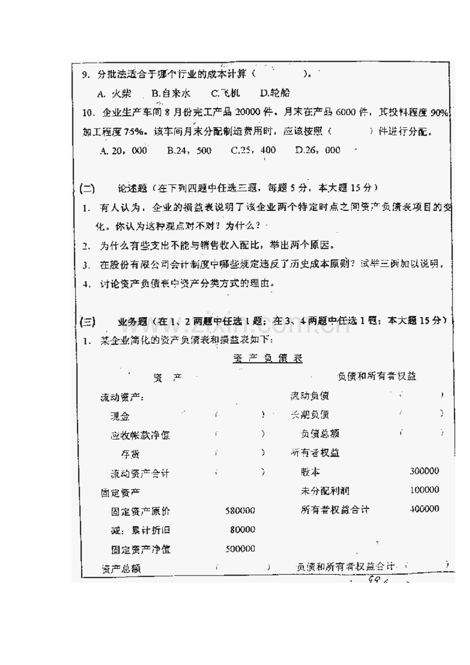 一、会计学原理试题(共20分)(不管那个研究方向皆答)