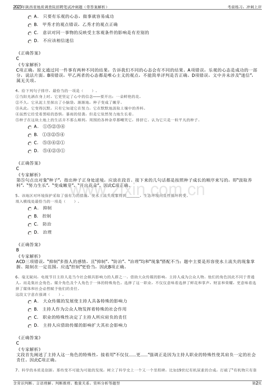 2023年陕西省地质调查院招聘笔试冲刺题(带答案解析)一、第一部分言语理解与表达(本部分包括表达与理解两方面的内容。请根据题目要求,在四个选项中选出一个最恰当的答案。)1、岛国牙买加因文化遗产丰富而广为人知,20世纪五六十年代,音乐产业为当地经济作出了重要贡献,一些人开始在首都金斯顿设立音乐中心,诞生了举世闻名的牙买加舞曲和雷鬼音乐。但是牙买加的音乐产业因缺乏版权保护制度,在20世纪70年代遭到了毁灭性的打击。20世纪90年代,牙买加人终于明白了版权保护的重要性,修订了完备的版权法,加上有力的执法行为,使牙买加的音乐产业拥有了众多的音乐家、音乐制作人和流行歌曲作者,每年能从雷鬼音乐在全球的销售中获得3亿美元的利润。牙买加音乐产业成功的原因在于,音乐制作人愿意投资,因为他们能够在将来获得回报。本段文字意在强调()。A 每个国家都应该因地制宜地发展本国的优势产业 B 版权保护制度对牙买加音乐产业成功起到的重要作用 C 牙买加依靠音乐产业在全球获得巨大利润 D 牙买加音乐产业的成功归功于音乐制作人愿意投资正确答案B专家解析文段讲述了牙买加音乐产业的发展历程,其音乐产业获得巨大利润应归功于版权保护制度的建立和有效执行,因此B项正确。2、例如位于我国四川的深地核天体物理实验室,其上覆盖的垂直岩石厚达2400米因此,旨在直接探测暗物质的实验室通常会建于极深的地下或山里,尽最大可能屏蔽掉这些干扰直接探测暗物质的方式类似于守株待兔当然,这种能量波动极其微弱,而且宇宙中的各种射线同样也有机会与这个原子核来一场亲密的邂逅,从而对实验结果产生干扰专家解释说,我们生活在一团暗物质云中,每秒钟可能有几百万甚至上千万的暗物质粒子穿过我们的身体直接探测暗物质的方法之一,就是利用精密的仪器密切观察大量的原子核,如果足够幸运,某一时刻暗物质碰撞到某个原子核,会在原子核上留下残余能量将以上6个句子重新排列,语序正确的是:A B C D正确答案C专家解析对比选项,确定首句,首句分别为句和句,句引出“直接探测暗物质的方式”的话题,句则具体解释了“直接探测暗物质的方法之一”,故句是对句的详细解释,根据观点+解释说明的逻辑顺序,句更适合作首句,排除A、B两项。继续观察选项,句出现“例如”为举例论述,之前应提出对应的观点。结合选项需判断句之前是句还是句,句提出直接探测暗物质的实验室通常会建于极深的地下或山里,与句“四川的深地核天体物理实验室”衔接恰当,故句应在句之前,C项当选。句提到暗物质粒子穿过我们的身体,与句话题不一致,无法衔接,D项排除。故正确答案为C。【文段出处】为何暗物质越来越少?能量低就会被宇宙“冰封”淘汰3、两个秀才一同去赴试,刚上路就遇到出殡的队伍,黑漆漆的棺材擦身而过。甲秀才大感晦气,心头愁绪郁结,结果没有考好,名落孙山;乙秀才则暗自高兴:棺材棺材,有官有财,是个好兆头。上了考场,他精神爽快,文思泉涌,果然一举成名。两个秀才回来后说自己的预感很灵验,甲说:“一碰上那秽物就知道不好了。”乙则说:“果然是有官有财了。”这段文字表明()。2023年陕西省地质调查院招聘笔试冲刺题(带答案解析)考前练习,冲刺上岸含常识判断、言语理解、判断推理、数量关系、资料分析等题型第1页 A 只要有乐观的心态,做事就容易成功 B 甲秀才的观点错误,乙秀才的观点正确 C 意识对同一事物的反映受主客观条件的影响是有差别的 D 不应该相信迷信正确答案C专家解析C项正确,原文通过同一件事有两种不同的结果,告诉我们不同的心态会有不同的结果。A项错误,乐观的心态是成功的一部分,说法片面。B项错误,甲乙两者的心态都是唯心主义的观点,不能简单评判是否正确。D项错误,文中并未涉及“迷信”,属无关项。4、给下列句子排序,最恰当的一项是()。当阳光洒在身上时,它更坚定了心中的信念要开出:一朵鲜艳的花。不久,它从泥土里探出了小脑袋,渐渐地,种子变成了嫩芽。从此,它变得沉默,只有它知道它在努力,它在默默地汲取土壤中的养料。虽然它经受着黑暗的恐惧,暴雨的侵袭,但是它依然努力地生长着。种子在这块土地上的生活并不那么顺利,周围的各种杂草都嘲笑它,排挤它。认为它只是一粒平凡的种子。A B C D 正确答案C专家解析第句点出对象“种子”,指出种子正身处逆境,应放在段首。接下来的几句话都是按照种子成长的顺序来写的,即“汲取养料”,“努力生长”,“变成嫩芽”,“开出花朵”。因此C项正确。5、该地区对环境保护采取了强有力的措施,使水土流失现象得到_,生态环境向良性循环转变。填入横线处最恰当的一项是()。A 抑制 B 控制 C 防治 D 治理正确答案B专家解析ACD三项错误,“抑制”多指人的感情,且“抑制”、“防治”、“治理”均和“现象”搭配不当;题中主要是形容使水土流失的现象掌握、限制在一定范围,应选“控制”更恰当,因此B项正确。6、毫无疑问,电视节目主持人是当今社会颇具影响力的人群之一。借助大众传媒的影响,主持人成为公众人物。他们的角色因此不同于普通人,而是集社会角色、媒介角色及个人角色于一体的特殊角色。选择了这一职业,不仅仅意味着选择了鲜花和掌声,财富和荣耀,更意味着选择了媒体和社会必然赋予他们的责任。