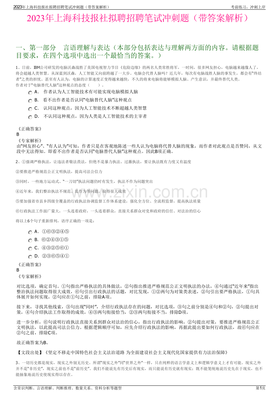 2023年上海科技报社拟聘招聘笔试冲刺题(带答案解析)一、第一部分言语理解与表达(本部分包括表达与理解两方面的内容。请根据题目要求,在四个选项中选出一个最恰当的答案。)1、日前,IBM公司研发的电脑沃森战胜了美国电视智力节目危险边缘的两名人类常胜将军,一时间,很多网友担心,电脑越来越像人了,将会超越人类智慧。从深蓝到沃森,人工智能又向前跨越了一大步。电脑会代替人脑吗?近几年,每次有电脑战胜人脑的事发生,都会有“终结者”之类的担忧。甚至有人认为,电脑的计算速度正变得越来越快,不久的将来电脑将能够模拟人脑、产生意识,并最终替代人类。作者对于“电脑替代人脑”这种观点的态度()。A 作者认为人工智能技术有可能实现电脑模拟人脑 B 看不出作者是否认同“电脑替代人脑”这种观点 C 认同这种观点,因为人工智能技术不断超越人类智慧 D 不认同这种观点,因为人类是人工智能技术的主宰者正确答案B专家解析由“网友担心”、“有人认为”可知,作者只是在客观地陈述一些人认为电脑将代替人脑的现象,而作者对此观点是否赞同,从文段中无法得知。即看不出作者是否认同“电脑替代人脑”这种观点。因此B项正确。2、强调严格执法,让违法者敬法畏法,但绝不是暴力执法、过激执法,要让执法既有力度又有温度要推进严格规范公正文明执法,提高司法公信力同时,一些地方运动式、“一刀切”执法问题仍时有发生,执法不作为问题突出近年来,我们整治执法不规范、乱作为等问题,取得很大成效要加强省市县乡四级全覆盖的行政执法协调监督工作体系建设,强化全方位、全流程监督,提高执法质量行政执法工作面广量大,一头连着政府,一头连着群众,直接关系群众对党和政府的信任、对法治的信心将以上6个句子重新排列,语序正确的一项是:A B C D正确答案B专家解析对比选项,确定首句。句指出严格执法的具体做法,句指出推进严格规范公正文明执法的办法,句通过“近年来”指出整治执法问题取得很大成效,句引出行政执法的话题,对比发现,两句为对策类表述,句引出要严格执法,句具体展开如何实现,句应在句之前,排除A项。接下来,寻找其他线索,句出现“同时”,介绍行政执法存在的问题,对比选项,句之前分别是句和句,句提出对策,句介绍执法工作取得的成效,两句衔接恰当,两句衔接不当,排除D项。进一步分析,句说明行政执法直接关系到群众对法治的信心,指出行政执法的影响,句提出对策,要推进严格规范公正文明执法,以此提高司法公信力。根据逻辑顺序可知,应先介绍行政执法的影响,再据此提出要如何行政执法,故句应在句之前,排除C项。故正确答案为B。【文段出处】坚定不移走中国特色社会主义法治道路 为全面建设社会主义现代化国家提供有力法治保障3、一切历史都是现实,现实之外别无历史。所谓“现实之外”同“世界之外”一样,只在纯粹的语言学意义上和逻辑学意义上才有可能。现实之外并不是“非历史”,现实之前也不是“前历史”。我们不能说先有历史后有现实,而只能说有历史就有现实;既不能笼统地说历史先在于现实,也不能抽象地说历史使现实得以存在。2023年上海科技报社拟聘招聘笔试冲刺题(带答案解析)考前练习,冲刺上岸含常识判断、言语理解、判断推理、数量关系、资料分析等题型第1页下列说法不符合文意的是()。A 历史存在于现实之中 B 没有现实就没有历史 C 历史与现实并无差别 D“现实之外”并不存在正确答案C专家解析文段首先指出“现实之外别无历史”,即表明“历史存在于现实之中”且“没有现实就没有历史”;接着指出“现实之外只在纯粹的语言学意义上和逻辑学意义上才有可能”,表明“现实之外并不存在”。C项,“历史与现实并无差别”在文中并未提及,无从得知。4、两个秀才一同去赴试,刚上路就遇到出殡的队伍,黑漆漆的棺材擦身而过。甲秀才大感晦气,心头愁绪郁结,结果没有考好,名落孙山;乙秀才则暗自高兴:棺材棺材,有官有财,是个好兆头。上了考场,他精神爽快,文思泉涌,果然一举成名。两个秀才回来后说自己的预感很灵验,甲说:“一碰上那秽物就知道不好了。”乙则说:“果然是有官有财了。”这段文字表明()。A 只要有乐观的心态,做事就容易成功 B 甲秀才的观点错误,乙秀才的观点正确 C 意识对同一事物的反映受主客观条件的影响是有差别的 D 不应该相信迷信正确答案C专家解析C项正确,原文通过同一件事有两种不同的结果,告诉我们不同的心态会有不同的结果。A项错误,乐观的心态是成功的一部分,说法片面。B项错误,甲乙两者的心态都是唯心主义的观点,不能简单评判是否正确。D项错误,文中并未涉及“迷信”,属无关项。5、在银河系中,恒星形成于巨型分子云的引力塌缩。而塌缩的残留物会围绕着新生的恒星转动,形成一个富含尘埃的气体盘,称为“原行星盘”。在年轻恒星中,周围存在原行星盘的比例会随恒星年龄增长而下降,存在的时长中值约为200万300万年。然而,正是通过原行星盘获得气体及所需物质,许多行星才能在这短短几百万年内大致演化成型。对于类似地球的其他行星而言,经历了原行星盘阶段,早期物质至少演化成了行星胚胎,并在原行星盘消散后经历进一步的碰撞和演化,最终形成现在的类地行星。根据这段文字,下列说法正确的是:A恒