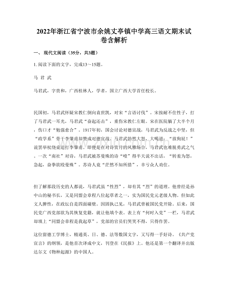 2022年浙江省宁波市余姚丈亭镇中学高三语文期末试卷含解析