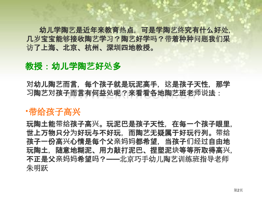 陶陶艺艺课课教教案案 第1页 幼儿学陶幼儿学陶艺艺是近年来教育是近年来教育热热点,可是学陶点,可是学陶艺终艺终究有什么好究有什么好处处,几几岁岁宝宝能宝宝能够够接收陶接收陶艺艺学学习习?陶?陶艺艺好学好学吗吗?带带着种种着种种问题问题我我们们采采访访了上海、北京、杭州、深圳四地教授。了上海、北京、杭州、深圳四地教授。教授:幼儿学陶教授:幼儿学陶艺好好处多多对幼儿陶幼儿陶艺而言,每个孩子就是玩泥高手,而言,每个孩子就是玩泥高手,这是孩子天性,那学是孩子天性,那学习陶陶艺对孩子而言有何益孩子而言有何益处呢?来看看各地陶呢?来看看各地陶艺班老班老师说法:法:带给孩子高兴带给孩子高兴玩陶土能玩陶土能带给孩子高孩子高兴。玩泥巴是孩子天性,在每一个孩子眼里,。玩泥巴是孩子天性,在每一个孩子眼里,世上万物只分世上万物只分为好玩与不好玩,而陶好玩与不好玩,而陶艺无疑属于好玩行列。无疑属于好玩行列。带给孩子一份高孩子一份高兴心情是每个父心情是每个父亲妈妈都希望,当孩子都希望,当孩子们经过自由地自由地玩陶土,随意地糊泥、用力敲打泥巴、捏塑泥玩陶土,随意地糊泥、用力敲打泥巴、捏塑泥块等等所取得高等等所取得高兴,不正是父不正是父亲妈妈希望希望吗?北京巧手幼儿陶艺训练班指导老师北京巧手幼儿陶艺训练班指导老师朱明跃朱明跃第2页提升幼儿艺术观赏力提升幼儿艺术观赏力陶陶艺是一是一门综合合创作作艺术,培养幼儿,培养幼儿艺术素素质,需要,需要经过长久重久重复复观赏操作操作再观赏再观赏再操作过程。丰富现实世界是创再操作过程。丰富现实世界是创作灵感源泉,只有发觉才能创造美。正是在这么培养过程中,幼作灵感源泉,只有发觉才能创造美。正是在这么培养过程中,幼儿艺术观赏能力得到了提升。儿艺术观赏能力得到了提升。上海维尼早教中心主任庄峰上海维尼早教中心主任庄峰有利个性发展有利个性发展学陶学陶艺是手、眼、是手、眼、脑协调互互动过程,儿童智力程,儿童智力发展起源于展起源于动作,作,而学陶而学陶艺过程不但能程不但能够开开发幼儿智力,幼儿智力,还能能够发展他展他们感知力、感知力、观察力和察力和创造力,提升幼儿造力,提升幼儿动手能力。手能力。陶土是不定型粘土精灵,任凭孩子怎么捏、揉都会是一件很有陶土是不定型粘土精灵,任凭孩子怎么捏、揉都会是一件很有特色作品,而孩子想象力越是丰富,出特色作品,而孩子想象力越是丰富,出现作品越是充作品越是充满童趣美。童趣美。陶陶艺制作制作还需要一定意志力,因需要一定意志力,因为哪怕完成一条粗哪怕完成一条粗线,也要,也要经过搓、磨等等工序,更不搓、磨等等工序,更不说完成一件小作品了。当孩子看到自己作完成一件小作品了。当孩子看到自己作品被上釉后品被上釉后烧制成彩色瓷器,一定制成彩色瓷器,一定对自己自己动手能力更有信心。手能力更有信心。杭州市青少年活动中心幼儿陶艺训练中心指导老师黄华高杭州市青少年活动中心幼儿陶艺训练中心指导老师黄华高 第3页促进亲子关系促进亲子关系现在在许多陶多陶艺培培训班都允班都允许父母陪着孩子,与孩子一起做一父母陪着孩子,与孩子一起做一件陶品件陶品过程是美妙,而跟孩子共同程是美妙,而跟孩子共同动手手过程是程是亲切。切。这对亲子关系是一个促子关系是一个促进。深圳市妇女儿童发展中心主任张晶深圳市妇女儿童发展中心主任张晶第4页教授:看宝宝年教授:看宝宝年纪学陶学陶艺不一不一样年年纪段幼儿段幼儿动手能力是不一手能力是不一样,所以在陶,所以在陶艺学学习上上也有差异,杭州市青少年活也有差异,杭州市青少年活动中心幼儿陶中心幼儿陶艺训练中心黄中心黄华高高指指导老老师认为24岁幼儿适合进行这么训练:岁幼儿适合进行这么训练:2岁:岁:这时孩子能孩子能认得黄色,注得黄色,注视小物体及小物体及图片可片可维持持50秒秒钟,出现了想象力萌芽。手部精细动作能够叠钟,出现了想象力萌芽。手部精细动作能够叠8块积木。块积木。3岁:岁:孩子孩子认得黄、得黄、红、绿三种三种颜色,想象伴随色,想象伴随经验和言和言语发展而展而发展,逐步展,逐步产生了生了带有最有最简单主主题和主角游和主角游戏活活动,但,但总说还是是贫乏、乏、简单,无意想象占了主,无意想象占了主导地位。能与地位。能与别孩子孩子一起玩游一起玩游戏。手部精。手部精细动作作发展:能展:能够自己拿小勺吃自己拿小勺吃饭,自,自己拿肥皂洗手,学己拿肥皂洗手,学习大人大人样自己拿蜡笔画自己拿蜡笔画线,逐步,逐步练习临摹摹几何几何图形,眼形,眼-手协调能力得到发展,即在双眼注视下,可用手协调能力得到发展,即在双眼注视下,可用手来完成所想做动作。手来完成所想做动作。第5页陶陶艺能力:能力:能能够对陶土搓、卷、陶土搓、卷、压,这个年个年纪孩子能孩子能够做一些做一些简单器物,比如小杯子。器物,比如小杯子。4岁:岁:这时,他,他们开始出开始出现一个探究心理,有探察一切愿望,只一个探究心理,有探察一切愿望,只要是新要是新鲜东西,都会引西,都会引发他他们注意,所以注意,所以这种有意注意就出种有意注意就出现了。手部精了。手部