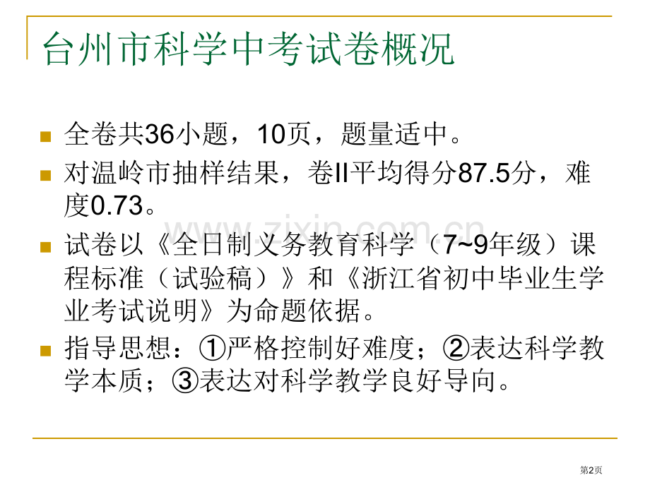 中考命题回来谈科学教学中考命题回来谈科学教学临海市教育局教研室临海市教育局教研室 金松涛金松涛 .7第1页台州市科学中考试卷概况n全卷共36小题,10页,题量适中。n对温岭市抽样结果,卷II平均得分87.5分,难度0.73。n试卷以全日制义务教育科学(79年级)课程标准(试验稿)和浙江省初中毕业生学业考试说明为命题依据。n指导思想:严格控制好难度;表达科学教学本质;表达对科学教学良好导向。第2页试卷特点1、重视基础,难度适中,面向全体。、重视基础,难度适中,面向全体。2、重视试验,加强对试验探究能力多角度考查。扩展、重视试验,加强对试验探究能力多角度考查。扩展考查试验探究很多能力,如数据处理、对照处理、证考查试验探究很多能力,如数据处理、对照处理、证据提取、变量控制和检测、试验评价等。据提取、变量控制和检测、试验评价等。3、贴进学生生活,紧密联络实际,重视生活情境创设,、贴进学生生活,紧密联络实际,重视生活情境创设,提升生活科学意识。提升生活科学意识。4、关注、关注STS,表达当今热点。,表达当今热点。5、重视学科渗透,关注情感教育,突出人文性和教育、重视学科渗透,关注情感教育,突出人文性和教育性性第3页命题时关注点n突破陈题,防范突破陈题,防范“过分练习过分练习”倾向。倾向。选新情境(如选新情境(如热点或乡土内容),或旧境新用热点或乡土内容),或旧境新用n关注科学探究能力考查。(以试验考新能力点,做过关注科学探究能力考查。(以试验考新能力点,做过试验与未做过试验要有点区分)试验与未做过试验要有点区分)n怎样控制好难度,做到新活而不难。怎样控制好难度,做到新活而不难。q题目增加必要说明(如填空或改填空为选择)题目增加必要说明(如填空或改填空为选择)q降低干扰(选项间干扰;文字表述要简练;防止冗余信息)降低干扰(选项间干扰;文字表述要简练;防止冗余信息)q降低直接考查对专业术语记忆降低直接考查对专业术语记忆q灵活设计评分标准灵活设计评分标准 n适当综合,考查适当综合,考查STS、科学史等。、科学史等。第4页把当代科学进展作为背景材料13人类胚胎干细胞来自受精卵形成人类胚胎干细胞来自受精卵形成56天后天后胚胎,在体外条件下能形成不一样组织和器官。胚胎,在体外条件下能形成不一样组织和器官。有科学家描述:胚胎干细胞有科学家描述:胚胎干细胞“可塑性可塑性”无以伦无以伦比。这里比。这里“可塑性可塑性”是指是指 A细胞分裂能力细胞分裂能力 B细胞分化能力细胞分化能力 C细胞生长能力细胞生长能力 D细胞变形能力细胞变形能力命题立意:在新情境中了解细胞分化;读懂科普读物。命题立意:在新情境中了解细胞分化;读懂科普读物。第5页把当代科学进展作为背景材料27、美国科学家普鲁伊特和洛尔在研究一个叫拟南芥植物时、美国科学家普鲁伊特和洛尔在研究一个叫拟南芥植物时发觉:亲代身上某种基因能够在它们子代身上完全消失,发觉:亲代身上某种基因能够在它们子代身上完全消失,随即又突然在子二代身上重新出现。换句话说,基因也会随即又突然在子二代身上重新出现。换句话说,基因也会隔代遗传!这一事实对现有经典遗传定律组成了挑战。隔代遗传!这一事实对现有经典遗传定律组成了挑战。(1)基因是)基因是DNA上一些片段,能决定生物性状。从拟南芥细上一些片段,能决定生物性状。从拟南芥细胞结构分析,基因主要存在于细胞胞结构分析,基因主要存在于细胞_ 中。中。(2)面对这一事实,你认为以下做法中最不可取一项是)面对这一事实,你认为以下做法中最不可取一项是_ 。(考查科学态度)(考查科学态度)A尝试用其它理论进行解释尝试用其它理论进行解释 B直接否定经典遗传定律直接否定经典遗传定律 C寻找更多试验证据支持寻找更多试验证据支持 D经过重复试验进行检验经过重复试验进行检验第6页引进科学史实作为命题情境151922年初,班廷与贝斯特从羊胰脏中提取年初,班廷与贝斯特从羊胰脏中提取出一个物质,注射到割掉胰脏而患糖尿病狗身出一个物质,注射到割掉胰脏而患糖尿病狗身上,发觉该狗病症减轻。现在,这种提取物被上,发觉该狗病症减轻。现在,这种提取物被大量生产,并用于治疗人类糖尿病,这种提取大量生产,并用于治疗人类糖尿病,这种提取物是物是 A血细胞血细胞 B血浆血浆 C消化液消化液 D激素激素第7页引进试验或生活情境作命题材料32、取一根火柴,在火柴头处缠绕上细铜丝,放入盛水大可乐瓶中,、取一根火柴,在火柴头处缠绕上细铜丝,放入盛水大可乐瓶中,使火柴恰能直立,刚好浸没水中,如图所表示。然后,盖上瓶盖,使火柴恰能直立,刚好浸没水中,如图所表示。然后,盖上瓶盖,用手挤压瓶体,火柴下沉;松开手后,火柴又上浮。以下是同学用手挤压瓶体,火柴下沉;松开手后,火柴又上浮。以下是同学们对这一现象解释:们对这一现象解释:解释解释1:手挤压瓶体,水密度变大,火柴下沉;松手时,水密度减小,:手挤压瓶体,水密度变大,火柴下沉;松手时,水密度减小,火柴上浮。火柴上浮。解释解释2:手挤压瓶体,水中压强增大,对火柴向下压力也增大,火柴:手挤压瓶体,水中压强增大,对火柴向下压力也增大,火柴便下沉;反之,火柴便上浮。便下沉;反之,火柴便上浮。解释解释3:木材做成火柴梗会吸水,在水