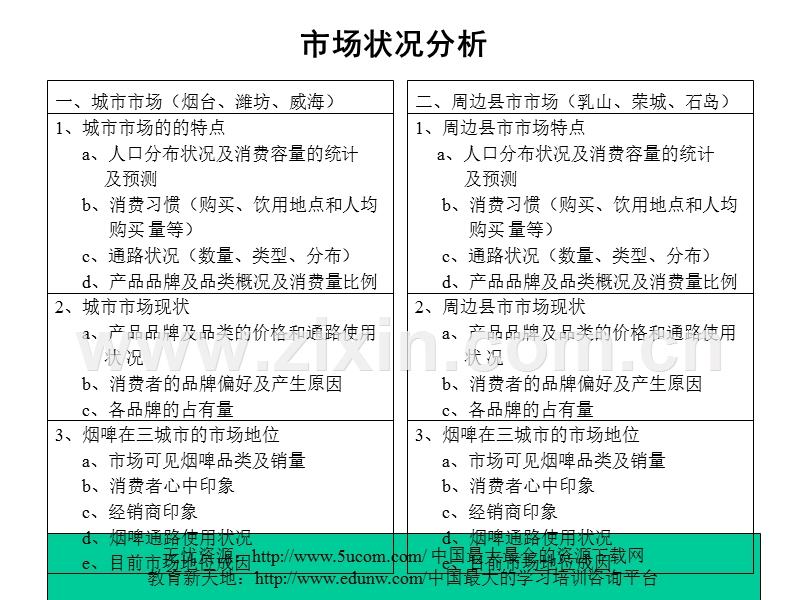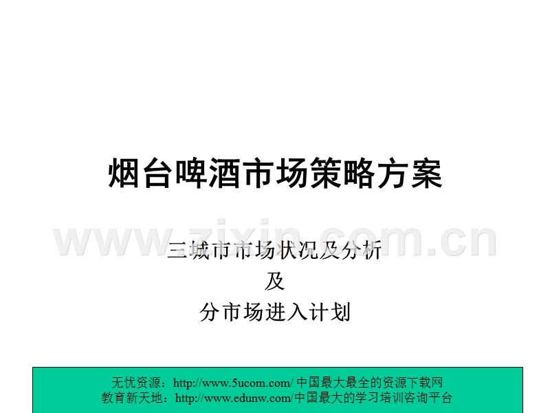 烟台啤酒市场策略方案,三城市市场状况及分析及分市场进入计划,市场状况分析,一、城市市场(烟台、潍坊、威海)1、城市市场的的特点a、人口分布状况及消费容量的统计及预测b、消费习惯(购买、饮用地点和人均购买量等)c、通路状况(数量、类型、分布)d、产品品牌及品类概况及消费量比例2、城市市场现状a、产品品牌及品类的价格和通路使用状况b、消费者的品牌偏好及产生原因c、各品牌的占有量3、烟啤在三城市的市场地位a、市场可见烟啤品类及销量b、消费者心中印象c、经销商印象d、烟啤通路使用状况e、目前市场地位成因,二、周边县市市场(乳山、荣城、石岛)1、周边县市市场特点a、人口分布状况及消费容量的统计及预测b、消费习惯(购买、饮用地点和人均购买量等)c、通路状况(数量、类型、分布)d、产品品牌及品类概况及消费量比例2、周边县市市场现状a、产品品牌及品类的价格和通路使用状况b、消费者的品牌偏好及产生原因c、各品牌的占有量3、烟啤在三城市的市场地位a、市场可见烟啤品类及销量b、消费者心中印象c、经销商印象d、烟啤通路使用状况e、目前市场地位成因,,,,,,,,,市场应用对策,一、城市市场(烟台、威海、潍坊)1、传播方面a、广告电视媒体的选择策略报纸媒体的选择策略户外媒体的选择策略其它媒体的选择媒体的整合策略(使用的先后顺序,费用强度、频率等)b、促销活动c、公关活动Event设计新闻的软性宣传2、产品方面a、各城市产品使用类型(主导、辅助)b、各类型产品通路选择及价格设定,二、周边县市市场(乳山、荣城、石岛)1、传播方面a、广告电视媒体的选择策略电台媒体的选择策略户外媒体的选择策略其它媒体的选择媒体的整合策略(使用的先后顺序,费用强度、频率等)b、促销活动c、公关活动Event设计2、产品方面a、各城市产品使用类型(主导、辅助)b、各类型产品通路选择及价格设定,,,,,,,乳山市场进入计划,,乳山市场,12瓶啤,超爽,罐装,暂不进入,桶啤,乳山市场进入计划,,乳山市场,超爽,罐装,桶啤,乳山市场进入计划,,乳山市场,超爽,桶啤,2、广场赠饮活动。,1、文艺演出流动下乡+现场售卖,,,2、针对经销商的买几送一活动(酒、小礼品、杯子等)。,1、饭店赠饮活动。,,,3、开瓶有奖活动。,,,罐啤,1、节前促销活动。,,2、销售奖励计划,根据销量制订不同的返奖金额。,,注:促销计划具体内容请见后。,报纸,电视,不设立单独CF计划,跟随威海CF计划。,,原因:本地没有强势报纸媒体。报纸发行渠道少,没有读报习惯。,不设立NP计划。,,,电台,暂不考虑。,,本地电台广告的认知度较低。,,原因:本地没有强势电视频道。山东卫视和威海电视台当地收视率较高。,,户外,不设立大的户外广告,但可考虑在零售点树立店头广告等方式。,,原因:店头广告能在购买阶段影响消费者,并且投入较低。,,