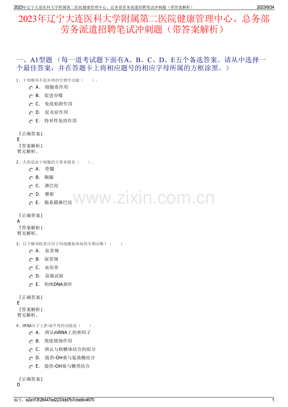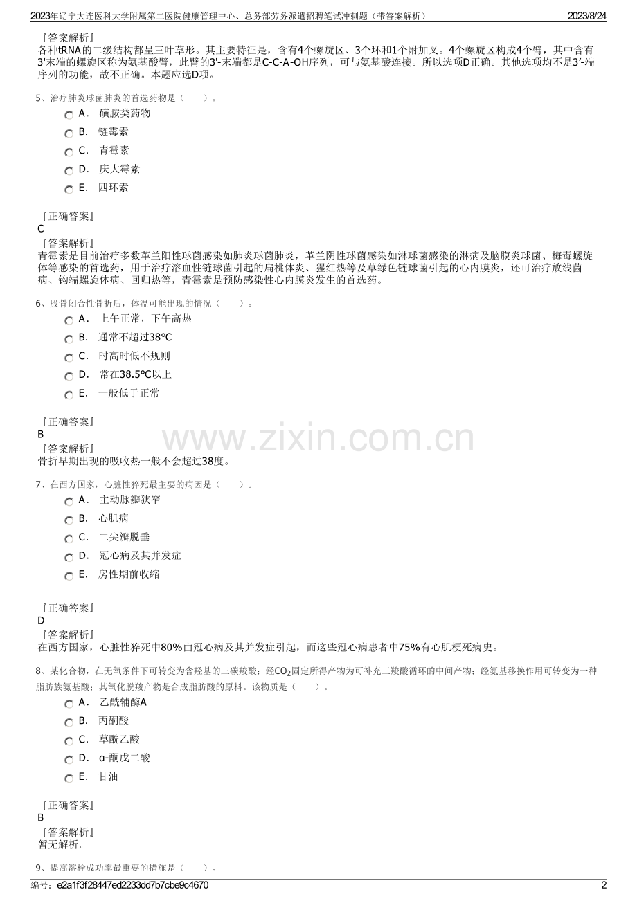 2023年辽宁大连医科大学附属第二医院健康管理中心、总务部劳务派遣招聘笔试冲刺题(带答案解析)一、A1型题(每一道考试题下面有A、B、C、D、E五个备选答案。请从中选择一个最佳答案,并在答题卡上将相应题号的相应字母所属的方框涂黑。)1、下列哪项不是补体的生物学功能()。A 细胞毒作用 B 促进吞噬 C 免疫粘附作用 D 促炎症作用 E 特异性免疫作用正确答案E答案解析暂无解析。2、人的造血干细胞的主要来源是()。A 骨髓 B 胸腺 C 淋巴结 D 脾脏 E 肠系膜淋巴结正确答案A答案解析暂无解析。3、以下哪项检查可用于钧端螺旋体病的早期诊断?()A 血常规 B 尿常规 C 血培养 D 显凝试验 E 钩体DNA探针正确答案E答案解析暂无解析。4、tRNA分子上3-端序列的功能是()。A 辨认mRNA上的密码子 B 剪接修饰作用 C 辨认与核糖体结合的组分 D 提供-OH基与氨基酸结合 E 提供-OH基与糖类结合正确答案D2023年辽宁大连医科大学附属第二医院健康管理中心、总务部劳务派遣招聘笔试冲刺题(带答案解析)2023/8/24编号:e2a1f3f28447ed2233dd7b7cbe9c46701答案解析各种tRNA的二级结构都呈三叶草形。其主要特征是,含有4个螺旋区、3个环和1个附加叉。4个螺旋区构成4个臂,其中含有3末端的螺旋区称为氨基酸臂,此臂的3-末端都是C-C-A-OH序列,可与氨基酸连接。所以选项D正确。其他选项均不是3-端序列的功能,故不正确。本题应选D项。5、治疗肺炎球菌肺炎的首选药物是()。A 磺胺类药物 B 链霉素 C 青霉素 D 庆大霉素 E 四环素正确答案C答案解析青霉素是目前治疗多数革兰阳性球菌感染如肺炎球菌肺炎,革兰阴性球菌感染如淋球菌感染的淋病及脑膜炎球菌、梅毒螺旋体等感染的首选药,用于治疗溶血性链球菌引起的扁桃体炎、猩红热等及草绿色链球菌引起的心内膜炎,还可治疗放线菌病、钩端螺旋体病、回归热等,青霉素是预防感染性心内膜炎发生的首选药。6、股骨闭合性骨折后,体温可能出现的情况()。A 上午正常,下午高热 B 通常不超过38 C 时高时低不规则 D 常在38.5以上 E 一般低于正常正确答案B答案解析骨折早期出现的吸收热一般不会超过38度。7、在西方国家,心脏性猝死最主要的病因是()。A 主动脉瓣狭窄 B 心肌病 C 二尖瓣脱垂 D 冠心病及其并发症 E 房性期前收缩正确答案D答案解析在西方国家,心脏性猝死中80%由冠心病及其并发症引起,而这些冠心病患者中75%有心肌梗死病史。8、某化合物,在无氧条件下可转变为含羟基的三碳羧酸;经CO2固定所得产物为可补充三羧酸循环的中间产物;经氨基移换作用可转变为一种脂肪族氨基酸;其氧化脱羧产物是合成脂肪酸的原料。该物质是()。A 乙酰辅酶A B 丙酮酸 C 草酰乙酸 D-酮戊二酸 E 甘油正确答案B答案解析暂无解析。9、提高溶栓成功率最重要的措施是()。2023年辽宁大连医科大学附属第二医院健康管理中心、总务部劳务派遣招聘笔试冲刺题(带答案解析)2023/8/24编号:e2a1f3f28447ed2233dd7b7cbe9c467029、提高溶栓成功率最重要的措施是()。A 联合使用抗凝药物 B 联合使用抗血小板聚集药物 C 增加溶栓药物的剂量 D 缩短发病至溶栓开始的时间 E 联合使用抗血小板聚集、抗凝药物正确答案D答案解析急性心肌梗死时,冠脉闭塞后2030分钟心肌发生坏死,12小时心肌呈凝固性坏死。在起病36小时(最多在12小时)内,使闭塞的冠状动脉再通,心肌得到再灌注,濒临坏死的心肌可能得以存活或使坏死范围缩小,对梗死后心肌重塑有利,预后改善,是一种积极的治疗措施。“时间就是心肌”,提高溶栓成功率最重要的措施是缩短发病至溶栓开始的时间。10、双胍类降糖药最常见的副作用为()。A 低血糖 B 乳酸性酸中毒 C 胃肠道反应 D 过敏性皮疹 E 肝功能异常正确答案C答案解析暂无解析。11、45岁男性,车祸3小时。入院诊断:骨盆骨折、左股骨干骨折及左胫骨开放性骨折。首先应密切观察的并发症是()。A 休克 B 泌尿系统感染 C 创口感染 D 疼痛 E 坠积性肺炎正确答案A答案解析多发骨折患者,而且是骨盆骨折、股骨干骨折和小腿开放骨折,骨盆主要是松质骨,邻近又有许多动静脉丛及大血管,骨折后可引起严重广泛出血,巨大的血肿可沿腹膜后间隙蔓延,可迅速引起休克,甚至死亡。股骨干骨折损伤了股深动脉分出的股骨干营养血管和附近的肌支,出血量较大,可出现休克前期或休克期的临床表现。开放骨折髓腔开放,出血不易自行停止,出血量也较多,因此本病人首先应密切观察的并发症是休克。12、一个体重50kg的患者需给予总热量1500kcaI的静脉营养支持,下列哪一项配方从理论上是正确的()。A 10%葡萄糖溶液1880ml,20%脂肪乳417ml,10%的复合氨基酸500ml B 50%葡萄糖溶液750ml,10%的复合氨基酸500ml C 50%葡萄糖溶液375ml,10%脂肪乳834ml,10%的复合氨基酸750ml D 50%葡萄糖溶液525ml,20%脂肪乳250ml,10%的复合氨基酸500ml E 10%葡萄糖溶液1380ml,20%脂肪乳417ml,10%的复合氨基酸500ml正确答案E答案解析暂无解析。13、肺炎支原体肺炎,临床特点是()。A 小婴儿多见 B 多无发热2023年辽宁大连医科大学附属第二医院健康管理中心、总务部劳务派遣招聘笔试冲刺题(带答案解析)2023/8/24编号:e2a1f3f28447ed2233dd7b7cbe9c46703 C 咳嗽突出 D 肺部体征明显 E 需头孢菌素治疗正确答案C答案解析暂无解析。14、一患者钡剂胃透检查,见胃壁僵硬,胃腔变小,黏膜皱襞大部分消失。应诊断为()。A 局限浸润型胃癌 B 弥漫浸润型胃癌 C 浅表扩散性胃