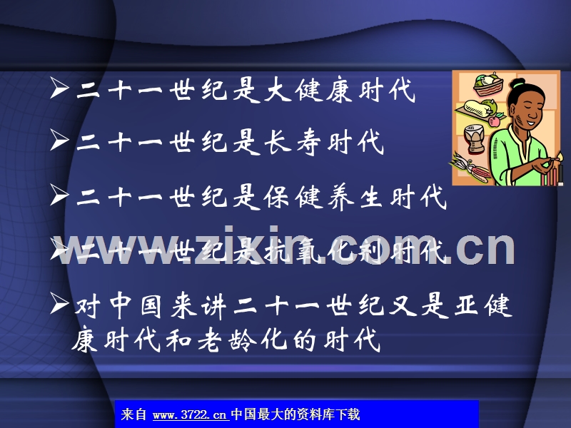 我国营养状况及发展,二十一世纪是大健康时代二十一世纪是长寿时代二十一世纪是保健养生时代二十一世纪是抗氧化剂时代对中国来讲二十一世纪又是亚健康时代和老龄化的时代,什么是大健康时代,二十一世纪追求健康已经成为大的趋势,人们比以往任何时候都更加关注健康.今天没有时间学习健康养生知识,将来就会有时间得病.,什么是长寿世纪,60岁不是人生的终点,而是第三阶段的刚刚开始.人们还有20年、30年、甚至40年大好时光的享受.联合国秘书长安南在一次国际老年人启动仪式上向全世界宣布:二十一世纪健康新标准:健康工作到60、80不衰老、开心活到100岁.,中国目前的健康状况,我国在1989年10月由中国营养学会常务理事制定了第一个〈我国的膳食指南〉.使用数年后,据全国营养调查和卫生统计资料表明,由于营养缺乏造成的儿童生长迟缓、缺铁性贫血、佝偻病虽逐年减少,但不可忽视的与膳食结构不合理有关的慢性非传染性疾病如:心脑血管疾病、糖尿病、高血压、恶性肿瘤等相关疾病却与日俱增.,用自己的嘴巴挖掘坟墓------葬送健康的人,与饮食相关的疾病,建国以来我国进行过四次全国性营养调查:第一次:1959年情况异常,结果未发表.第二次:1982年总结汇编的形式公布.第三次:1992年10万居民个体膳食、体测、家庭收入等多方面材料,有参考意义.(卫生部)第四次:2002年.(国务院向社会公布),2002年调查结果,动物性食品人均日消费:210-248克薯类食品人均日消费:87-49克深色蔬菜人均日消费:102-91克浅色蔬菜人均日消费:208-184克水果类人均日消费:49-45克脂肪从19-28%(25-45-83-92克)总结一句话:该吃的都降了该少吃的都升了!,营养失衡导致相关疾病呈高发状态:大城市成人超重率高达30.0%,肥胖12.3%,18岁以上高血压发病率18.8%,全国有大约1.8亿,血脂异常1.6亿,糖尿病患者2000多万、空腹血糖受损2000多万,世界排名第二.2000年全球早逝群体中47%源于营养失衡.,2002年全国营养健康调查报告看来,我国居民面临“营养缺乏和营养结构失衡”的双重挑战.微量元素严重缺乏的有:钙、铁、碘、维生素A,维生素A边缘缺乏率上升为45.1%,相当于全国5.8亿人口,10年补钙,钙摄入人均391毫克,缺乏从50%上升到59%,2亿人口缺铁(女1/2)1.6亿人口热能—蛋白质摄入不足.,营养状况“非抓不可”危险阶段,每天约有15000人死于慢性非传染性疾病,已占全部死亡的70%.世界银行统计表明,仅微量元素缺乏,对发展中国家经济造成的损失至少占国民生产总值(GDP)的3—5%.,卫生部部长高强的一段话,今后的10-20年,是我国改善国民营养健康的关键战略时期,抓住机遇、适时干预、会事半功倍.否则,不仅要影响几代人的健康素质,也会因不堪重负的疾病负担,消耗社会经济发展的成果.,中国营养学会秘书长的一段话,长期以来,我国“重临床、轻预防”.现在正是我国预防营养相关疾病的最佳时期,如果再过10年、20年不预防,造成大量慢性病的发生,其后果将会严重地影响国家经济的发展,这绝非危言耸听!,卫生部副部长在记者招待会上发言,营养是人类生命的源泉和物质基础,在很大程度上决定着人类的体格发育、心理发育和健康状况.营养缺乏与失衡都会对生命周期产生严重影响.一方面,对人群健康水平造成不利影响,引起免疫功能下降,患病率增加,导致居民因病致贫、因病返贫,增加国家、社会、个人的负担,阻碍了经济的发展.,另一方面,营养不良造成人口整体素质下降,体力、智力发育不良、生产力降低,影响到我国在经济发展中的国际竞争力.一个国家营养事业的发展水平如何,能够影响这个国家的经济、社会发展与民族振兴的步伐,这是已经在许多国家实践中已经得到证实的.,党的十六大提出了全面建设小康社会的宏伟蓝图,第一次将公民健康素质、思想道德素质、科学文化素质相提并论,并将这三大素质综合为人的全面和谐发展。健康是每个人和社会共同积累和分享的财富和资源。资源就是可开发、可利用,不能闲置、更不可以烂开采造成枯竭。,外国的经验,世界发达国家的经验表明,人均GDP已达800美元以上,是人们膳食模式转型的关键时期,也是疾病谱的转变关键时期,如不加以干预和引导,饮食相关性疾病就会呈现快速上升趋势.2003年,我国人均GDP值已经突破了1000美金,有效干预正当其时!,营养对健康的作用,人可以一生不吃药,但是不能一天不吃饭.我国吃的三个阶段:1、吃饱求生存;2、好吃求美味;3、吃好求健康.,如何正确吃出健康,做了一辈子的饭不会做饭的怪现象.《食物相克》书籍泛滥成灾:连续数月荣登生活类图书榜首书越出越厚-上百种到上千种2006年4月4日顺峰会议:李瑞芬、翁维健、吴美云、何计国---再不说话等于默认!专家共识:夸大和渲染,用“克”的说法存在误导、应提倡“食物多样化”,这才是保证营养安全的最基本的有益保障.,李瑞芬:我国唯一国际注册营养师;翁维健:中国医药大学养生康复专业教授;吴美云:北大62年化学系、营养分析主任;何计国:中国农大食品营养与安全系主任。2006年4月7日北京青年报五版《饮食主义》恐怖:伤身、身体不适、失明、死亡;立场:嗤之以鼻;假设:上至满汉全席、下至家常便饭都不能吃;辩诬:猪肝红豆-鸡屎解之是对中医的亵渎;案例:黄瓜西红柿、卧鸡蛋白糖、菠菜豆腐;结论:食物多样化是保证营养安全的最基本的原则。,目前世界饮食营养模式,欧美饮食模