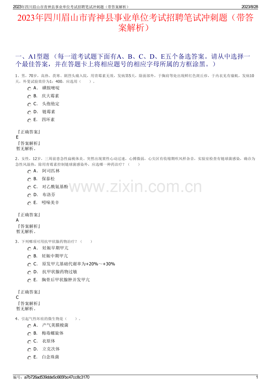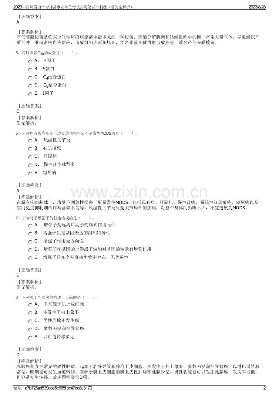 2023年四川眉山市青神县事业单位考试招聘笔试冲刺题(带答案解析)一、A1型题(每一道考试题下面有A、B、C、D、E五个备选答案。请从中选择一个最佳答案,并在答题卡上将相应题号的相应字母所属的方框涂黑。)1、男,70岁,高热、畏寒、剧烈头痛入院,用青霉素无效,发病第5天,除面部外,于胸肩等处出现鲜红色斑丘疹,于内衣见有瘙虮,发病10天,外斐试验效价为1:400,应选用()。A 磺胺嘧啶 B 庆大霉素 C 头孢他定 D 链霉素 E 四环素正确答案E答案解析暂无解析。2、女性,12岁,三周前患急性扁桃体炎。突然出现窦性心动过速,心搏微弱,心尖区有收缩期吹风样杂音,实验室检查有链球菌感染,确诊为急性风湿热,除用青霉素控制链球菌感染外,应选哪一种药治疗?()A 阿司匹林 B 保泰松 C 对乙酰氨基酚 D 布洛芬 E 吲哚美辛正确答案A答案解析暂无解析。3、下列哪项可用抗甲状腺药物治疗?()A 妊娠早期甲亢 B 妊娠中期甲亢 C 原发甲亢基础代谢率为+20%+30%D 抗甲状腺药物过敏 E 胸骨后甲状腺肿并发甲亢正确答案C答案解析暂无解析。4、引起气性坏疽的微生物是()。A 产气荚膜梭菌 B 梅毒螺旋体 C 衣原体 D 立克次体 E 白念珠菌2023年四川眉山市青神县事业单位考试招聘笔试冲刺题(带答案解析)2023/8/28编号:a7b726ad539dde5c665fbc47cc8c31701正确答案A答案解析产气荚膜梭菌是临床上气性坏疽病原菌中最多见的一种梭菌,因能分解肌肉和结缔组织中的糖,产生大量气体,导致组织严重气肿,继而影响血液供应,造成组织大面积坏死,加之本菌在体内能形成荚膜,故名产气夹膜梭菌。5、可以灭活C3b的成分是()。A H因子 B S蛋白 C C4结合蛋白 D C8结合蛋白 E I因子正确答案E答案解析暂无解析。6、下列原有疾病基础上遭受急性损害后不易发生MODS的是()。A 风湿性关节炎 B 心肌梗死 C 肝硬化 D 慢性肾小球肾炎 E 糖尿病正确答案A答案解析在原有疾病基础上,遭受下列急性损害,更易发生MODS,包括冠心病、肝硬化、慢性肾病、系统性红斑狼疮、糖尿病以及应用免疫抑制剂治疗与营养不良等。风湿性关节炎只是关节局部的疾病,对整个身体的影响不大,不宜进展为MODS。7、下列对于增强子的叙述错误的是()。A 增强子是远离启动子的顺式作用元件 B 增强子决定基因表达的组织特异性 C 增强子作用无方向性 D 增强子在基因的上游或下游均对基因的转录有增强作用 E 增强子只在个别真核生物中存在,无普遍性正确答案E答案解析暂无解析。8、下列关于乳腺癌的描述,正确的是()。A 多来源于肌上皮细胞 B 多发生于内上象限 C 男性乳腺不发生癌 D 多数为浸润性导管癌 E 以血道转移多见正确答案D答案解析乳腺癌是女性常见的恶性肿瘤,起源于乳腺导管和腺泡上皮细胞。多发生于外上象限,多数为浸润性导管癌,以淋巴道转移常见,晚期也可发生血道转移。来源于肌上皮细胞的肌上皮性肿瘤在乳腺少见。男性乳腺也可以发生乳腺癌,发病率很低,但容易发生转移。故本题答案为D项。2023年四川眉山市青神县事业单位考试招聘笔试冲刺题(带答案解析)2023/8/28编号:a7b726ad539dde5c665fbc47cc8c317029、婴儿期“生理性贫血”发生在什么时间()。A 生后1个月2个月 B 生后15天1个月 C 生后2个月3个月 D 生后3个月4个月 E 生后4个月5个月正确答案C答案解析暂无解析。10、下述除哪一项。外均为结核结节的成分?()A Langhans巨细胞 B 类上皮细胞 C 中性粒细胞 D 成纤维细胞 E 淋巴细胞正确答案C答案解析暂无解析。11、乳中不饱和脂肪酸含量高,有利于小儿()。A 脑的发育 B 肾的发育 C 骨骼的发育 D 肠道双歧杆菌的生长 E 肠道乳酸杆菌的生长正确答案A答案解析暂无解析。12、糖皮质激素本身没有缩血管效应,但能加强去甲肾上腺素的缩血管作用,这种作用称为()。A 协同作用 B 致敏作用 C 增强作用 D 允许作用 E 辅助作用正确答案D答案解析允许作用是指某一激素虽不能对某些器官、组织或细胞直接发挥作用,但其存在却是另一种激素发挥作用的前提。氢化可的松对血管平滑肌并无直接增强收缩的作用,但只有在其存在的情况下,儿茶酚胺类激素(去甲肾上腺素)才能充分发挥其缩血管的作用。其机制可能是由于氢化可的松能够调节儿茶酚胺类激素靶细胞膜上肾上腺素能受体的数目或调节受体中介的细胞内信息传递过程,如影响腺苷酸环化酶的活性及cAMP的生成过程等。故本题答案为D项。13、医生使用药物结束一位符合安乐死条件的病人的痛苦生命,称为()。A 自杀安乐死 B 医助安乐死 C 被动安乐死2023年四川眉山市青神县事业单位考试招聘笔试冲刺题(带答案解析)2023/8/28编号:a7b726ad539dde5c665fbc47cc8c31703 D 主动安乐死 E 强迫安乐死正确答案D答案解析安乐死可分为主动安乐死和被动安乐死,前者是指主动使用药物使病人无痛苦死去;后者指在病人濒危状态放弃抢救治疗。14、关于ABO溶血母婴血型不合,以下哪种情况最多见?()母血型婴儿血型 A ABO B ABA或B C A或B O D O AB E O A或B正确答案E答案解析暂无解析。15、患者,女,65岁,右乳头瘙痒1年,逐渐加重为刺痛、烧灼感,乳头有碎屑脱皮,轻度糜烂。首先应考虑诊断()。A Paget病 B 乳腺炎 C 乳腺导管内乳头状瘤 D 乳腺增生症 E 乳头皮肤鳞癌正确答案A答案解析暂无解析。16、确切地说,按规定积极参加会诊,这一做法最能体现的正确处理医务人员之间关系的意义和道德原则为()。A 有利于加深朋友之谊,彼此信任、礼尚