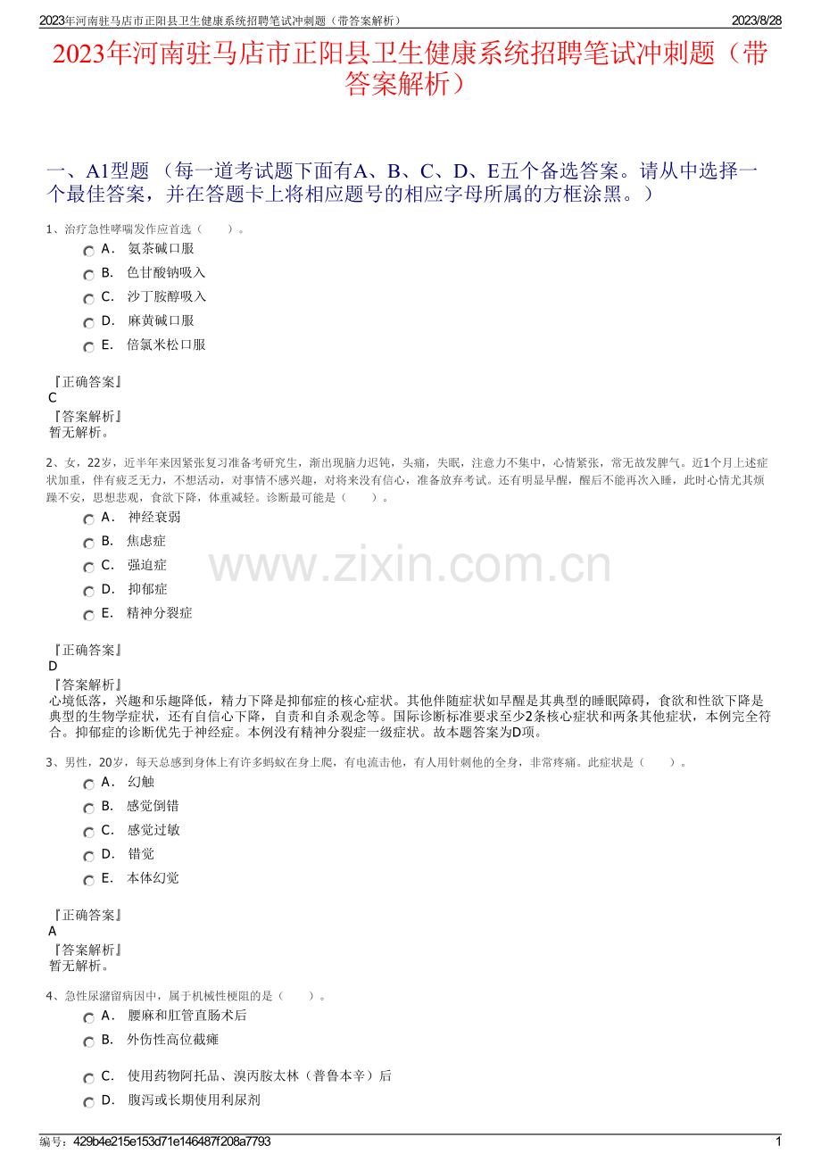2023年河南驻马店市正阳县卫生健康系统招聘笔试冲刺题(带答案解析)一、A1型题(每一道考试题下面有A、B、C、D、E五个备选答案。请从中选择一个最佳答案,并在答题卡上将相应题号的相应字母所属的方框涂黑。)1、治疗急性哮喘发作应首选()。A 氨茶碱口服 B 色甘酸钠吸入 C 沙丁胺醇吸入 D 麻黄碱口服 E 倍氯米松口服正确答案C答案解析暂无解析。2、女,22岁,近半年来因紧张复习准备考研究生,渐出现脑力迟钝,头痛,失眠,注意力不集中,心情紧张,常无故发脾气。近1个月上述症状加重,伴有疲乏无力,不想活动,对事情不感兴趣,对将来没有信心,准备放弃考试。还有明显早醒,醒后不能再次入睡,此时心情尤其烦躁不安,思想悲观,食欲下降,体重减轻。诊断最可能是()。A 神经衰弱 B 焦虑症 C 强迫症 D 抑郁症 E 精神分裂症正确答案D答案解析心境低落,兴趣和乐趣降低,精力下降是抑郁症的核心症状。其他伴随症状如早醒是其典型的睡眠障碍,食欲和性欲下降是典型的生物学症状,还有自信心下降,自责和自杀观念等。国际诊断标准要求至少2条核心症状和两条其他症状,本例完全符合。抑郁症的诊断优先于神经症。本例没有精神分裂症一级症状。故本题答案为D项。3、男性,20岁,每天总感到身体上有许多蚂蚁在身上爬,有电流击他,有人用针刺他的全身,非常疼痛。此症状是()。A 幻触 B 感觉倒错 C 感觉过敏 D 错觉 E 本体幻觉正确答案A答案解析暂无解析。4、急性尿潴留病因中,属于机械性梗阻的是()。A 腰麻和肛管直肠术后 B 外伤性高位截瘫 C 使用药物阿托品、溴丙胺太林(普鲁本辛)后 D 腹泻或长期使用利尿剂2023年河南驻马店市正阳县卫生健康系统招聘笔试冲刺题(带答案解析)2023/8/28编号:429b4e215e153d71e146487f208a77931 E 尿道结石正确答案E答案解析暂无解析。5、高位截瘫患者排尿障碍临床表现为()。A 尿失禁 B 尿潴留 C 血尿 D 尿崩症 E 少尿正确答案A答案解析排尿反射的基本中枢在脊髓腰骶段。正常情况下膀胱充盈的刺激传入脊髓中枢引起的排尿反射受到大脑皮层高级中枢的控制。高位截瘫后,脊髓中枢失去大脑皮层的意识控制,故表现为尿失禁。6、甲亢患者胫前黏液性水肿的特异性组织学表现为()。A 淋巴细胞浸润 B 糖蛋白及酸性糖胺聚糖沉积 C 纤维组织增生 D 线粒体增多 E 脂肪浸润正确答案B答案解析暂无解析。7、高压蒸汽灭菌的标准方法是在1.05kg/cm2蒸气压力下(121.3),灭菌时间为()。A 15分钟 B 610分钟 C 1114分钟 D 1520分钟 E 2125分钟正确答案D答案解析暂无解析。8、下列哪项是医学伦理学中最古老、最有生命力的医德范畴?()A 医疗保密 B 医疗荣誉 C 医疗权利 D 医疗公正 E 医疗义务正确答案A答案解析医疗保密是最古老的医学道德规范,早在2500多年前,希波克拉底就说过:“凡我所见所闻,无论有无职业关系,我认为应守秘密者,我愿保守秘密。”2023年河南驻马店市正阳县卫生健康系统招聘笔试冲刺题(带答案解析)2023/8/28编号:429b4e215e153d71e146487f208a779329、男,5岁。眼距宽,眼裂小,鼻梁低平,舌常伸出口外,流涎多,有通贯掌,合并先天性心脏病,最有确诊意义的检查为()。A 听力测定 B 胸部X线检查 C 肝功能测定 D 染色体核型分析 E 腹部B型超声检查正确答案D答案解析本患儿外貌为21-三体综合征的特殊面容。本病确诊依靠染色体检查。10、下列哪项是HMG-CoA还原酶抑制剂?()A 烟酸 B 考来烯胺 C 非诺贝特 D 洛伐他汀 E 普罗布考正确答案D答案解析暂无解析。11、缺铁性贫血根治的关键是()。A 输血治疗 B 病因治疗 C 铁剂治疗 D 饮食治疗 E 预防各种感染正确答案B答案解析暂无解析。12、针对高钾血症伴发心律失常的治疗是()。A 静脉注射乳酸林格液 B 口服山梨醇 C 静脉注射乳酸钠 D 静脉注射葡萄糖酸钙 E 口服阴离子交换树脂正确答案D答案解析钙与钾有对抗作用,当高钾血症伴发心律失常时,为控制心律失常,可静脉注射10%葡萄糖酸钙,以缓解钾对心肌的毒性作用。13、甲亢患者准备手术前,至少应把基础代谢率降至()。A 10%以下 B 20%以下 C 25%以下 D 30%以下2023年河南驻马店市正阳县卫生健康系统招聘笔试冲刺题(带答案解析)2023/8/28编号:429b4e215e153d71e146487f208a77933 E 35%以下正确答案B答案解析暂无解析。14、关于核酸分子杂交的叙述,错误的是()。A 核酸分子杂交基于核酸的变性和复性的特性 B 来源不同的DNA单链分子的结合 C DNA也可与RNA杂交 D RNA也可与多肽链杂交 E 杂交技术可用于核酸结构和功能的研究正确答案D答案解析暂无解析。15、根据医疗事故处理条例,患者一方向卫生行政部门提出医疗事故争议处理申请的期限为自知道或应当知道发生人身损害之日起()。A 15日内 B 3个月内 C 6个月内 D 1年内 E 2年内正确答案D答案解析参见医疗事故处理条例第三十七条第二款:当事人自知道或者应当知道其身体健康受到损害之日起1年内,可以向卫生行政部门提出医疗事故争议处理申请。16、从小鼠的一种有荚膜的致病性肺炎球菌中提取出的DNA,可使另一种无荚膜、不具有致病性的肺炎球菌转变为有荚膜并具致病性的肺炎球菌,而蛋白质、RNA无此作用,由此,可以证明()。A DNA是遗传物质,蛋白质是遗传信息的体现者 B DNA是遗传信息的体现者,蛋白质是遗传物质 C DNA与蛋白质均是遗传物质 D RNA是遗传物质,DNA和蛋白质是遗传信息的体现者 E DNA和蛋白质是遗传物质,RNA是遗传信息的体现者正确答
