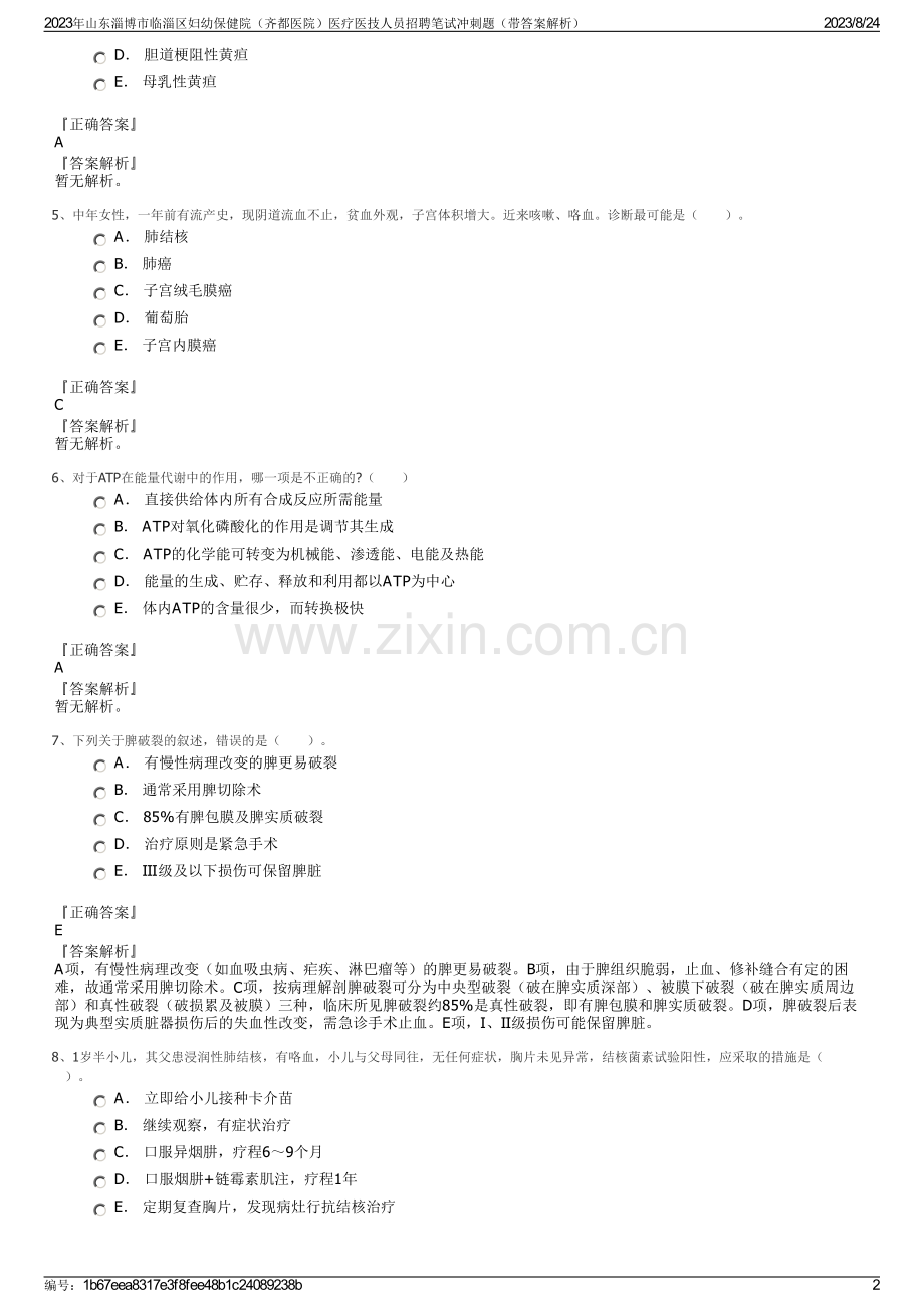 2023年山东淄博市临淄区妇幼保健院(齐都医院)医疗医技人员招聘笔试冲刺题(带答案解析)一、A1型题(每一道考试题下面有A、B、C、D、E五个备选答案。请从中选择一个最佳答案,并在答题卡上将相应题号的相应字母所属的方框涂黑。)1、佝偻病小儿主要表现有方颅,肋骨串珠,手镯,足镯样改变,估计其年龄大概是()。A 5岁以后 B 3岁左右 C 1岁左右 D 6个月以下 E 78个月正确答案E答案解析暂无解析。2、下列哪项不属于处理医务人员之间关系的道德原则?()A 共同维护病人利益和社会公益原则 B 彼此平等、互相尊重原则 C 知情同意和保守秘密原则 D 彼此独立、互相支持和帮助原则 E 互相学习、共同提高和发挥优势原则正确答案C答案解析共同维护病人利益和社会公益原则;彼此平等、互相尊重原则;彼此独立、互相支持和帮助原则;互相学习、共同提高和发挥优势原则属于处理医务人员之间关系的道德原则。此外还有彼此信任、互相协作和监督原则。故本题答案为C项。3、在免疫应答过程中,巨噬细胞能够()。A 产生抗体 B 表达TCR C 产生细胞因子 D 表达CD3分子 E 发生基因重排正确答案C答案解析大多数细胞因子具有上调免疫功能的作用。其中IL-2、IL-12和IFN-对T细胞功能上调作用最强;IL-4、IL-5、IL-6和IL-10对B细胞功能上调作用最强。有些细胞因子可下调免疫功能,如TGF-可抑制造血干细胞、T细胞、B细胞、上皮细胞和内皮细胞的生长,并可抑制巨噬细胞和NK细胞的吞噬和杀伤活性;IL-4、IL-410和IL-13可通过抑制巨噬细胞活化和抑制CD4+Th1细胞产生IFN-、IL-2和TNF-等细胞因子的作用,下调细胞免疫功能;IFN-可通过抑制CD4+Th2细胞产生IL-4、5、6、10等细胞因子的作用,下调体液免疫功能。故本题答案为C项。4、新生儿生后17小时出现黄疸,第2天查胆红素水平150mol/L,第3天胆红素水平达到320mol/L,母亲血型“O”型“Rh阳性”,小儿血型“B”型“Rh阳性”,最可能的原因是()。A 溶血性黄疸 B 生理性黄疸 C 肝细胞性黄疸2023年山东淄博市临淄区妇幼保健院(齐都医院)医疗医技人员招聘笔试冲刺题(带答案解析)2023/8/24编号:1b67eea8317e3f8fee48b1c24089238b1 D 胆道梗阻性黄疸 E 母乳性黄疸正确答案A答案解析暂无解析。5、中年女性,一年前有流产史,现阴道流血不止,贫血外观,子宫体积增大。近来咳嗽、咯血。诊断最可能是()。A 肺结核 B 肺癌 C 子宫绒毛膜癌 D 葡萄胎 E 子宫内膜癌正确答案C答案解析暂无解析。6、对于ATP在能量代谢中的作用,哪一项是不正确的?()A 直接供给体内所有合成反应所需能量 B ATP对氧化磷酸化的作用是调节其生成 C ATP的化学能可转变为机械能、渗透能、电能及热能 D 能量的生成、贮存、释放和利用都以ATP为中心 E 体内ATP的含量很少,而转换极快正确答案A答案解析暂无解析。7、下列关于脾破裂的叙述,错误的是()。A 有慢性病理改变的脾更易破裂 B 通常采用脾切除术 C 85%有脾包膜及脾实质破裂 D 治疗原则是紧急手术 E 级及以下损伤可保留脾脏正确答案E答案解析A项,有慢性病理改变(如血吸虫病、疟疾、淋巴瘤等)的脾更易破裂。B项,由于脾组织脆弱,止血、修补缝合有定的困难,故通常采用脾切除术。C项,按病理解剖脾破裂可分为中央型破裂(破在脾实质深部)、被膜下破裂(破在脾实质周边部)和真性破裂(破损累及被膜)三种,临床所见脾破裂约85%是真性破裂,即有脾包膜和脾实质破裂。D项,脾破裂后表现为典型实质脏器损伤后的失血性改变,需急诊手术止血。E项,、级损伤可能保留脾脏。8、1岁半小儿,其父患浸润性肺结核,有咯血,小儿与父母同往,无任何症状,胸片未见异常,结核菌素试验阳性,应采取的措施是()。A 立即给小儿接种卡介苗 B 继续观察,有症状治疗 C 口服异烟肼,疗程69个月 D 口服烟肼+链霉素肌注,疗程1年 E 定期复查胸片,发现病灶行抗结核治疗2023年山东淄博市临淄区妇幼保健院(齐都医院)医疗医技人员招聘笔试冲刺题(带答案解析)2023/8/24编号:1b67eea8317e3f8fee48b1c24089238b2正确答案C答案解析小儿年龄小;与活动性肺结核父亲密切接触;结核菌素试验阳性。虽然无任何症状,胸片未见异常,除与结核病人隔离外,必须预防性治疗,口服异烟肼10mg/(kgd),疗程69个月。9、贫血伴轻度黄疸,最可能的诊断为()。A 脾功能亢进 B 再生障碍性贫血 C 特发性血小板减少性紫癜 D 溶血性贫血 E 急性白血病正确答案D答案解析暂无解析。10、24岁女性,干部,告诉医师自己在饭厅吃饭觉得菜很淡,想拿酱油,但别人先拿走了;想喝水时,有人即去倒水,认为别人了解自己的想法。该症状属于()。A 嫉妒妄想 B 罪恶妄想 C 夸大妄想 D 超价观念 E 思维被洞悉正确答案E答案解析病人认为自己所想的事,未经言语文字表达而被周围人洞悉。但通过何种方式被人知道则不一定能描述清楚。故本题答案为E项。11、早期诊断化脓性关节炎,以下哪项检查最有确诊价值?()A X线照片 B 血细胞计数及分类 C 血培养 D 血沉 E 关节穿刺及关节液检查正确答案E答案解析化脓性关节炎根据全身与局部症状和体征,诊断不难。X线表现出现较迟。关节穿刺和关节液检查对早期诊断很有价值。12、低血钾的原因不包括()。A 呕吐进食少 B 腹泻丢失多 C 尿中排泄 D 酸中毒时钾向细胞内转移 E 久泻和营养不良正确答案D答案解析暂无解析。2023年山东淄博市临淄区妇幼保健院(齐都医院)医疗医技人员招聘笔试冲刺题(带答案解析)2023/8/24编