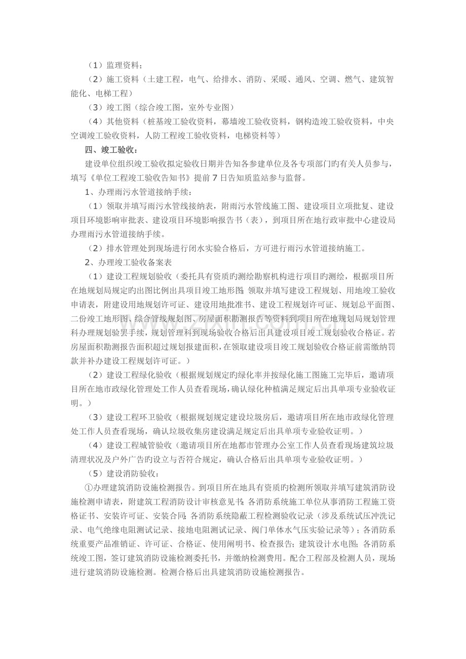 ⑨竣工验收报告,建设项目竣工规划验收合格证,建筑工程竣工消防验收意见书,建设项目设计卫生审查承认书,环保部门承认批准文献,建设工程档案接受证明书及验收意见书,城管验收单,环卫项目验收单,绿化验收单,单位工程质量保修书,商品房住宅质量保证书和住宅使用阐明书到项目所在地工程质量监督机构办理竣工验收备案表。