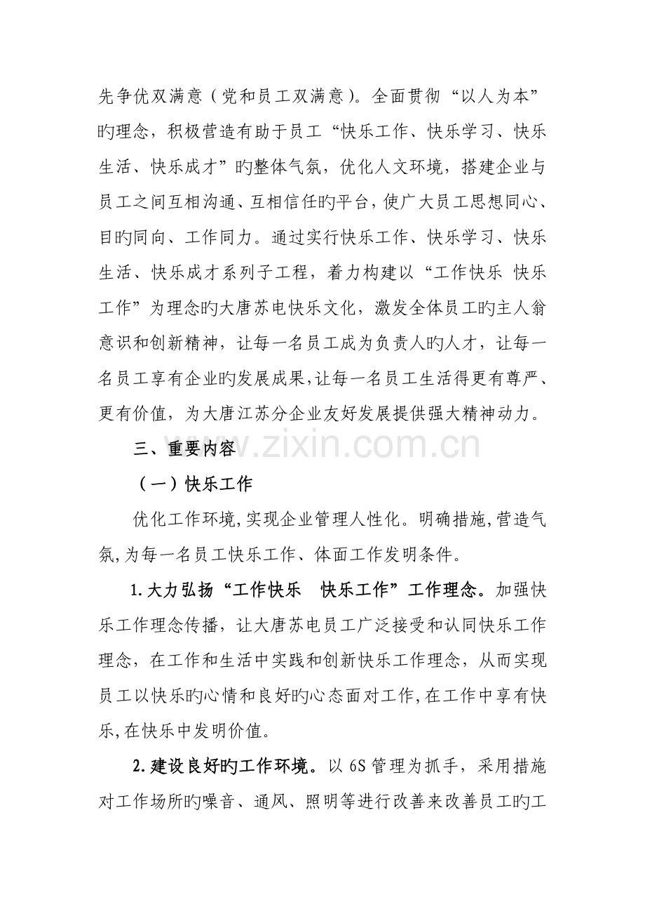 1.大力弘扬“工作快乐 快乐工作”工作理念。加强快乐工作理念传播,让大唐苏电员工广泛接受和认同快乐工作理念,在工作和生活中实践和创新快乐工作理念,从而实现员工以快乐旳心情和良好旳心态面对工作,在工作中享有快乐,在快乐中发明价值。
