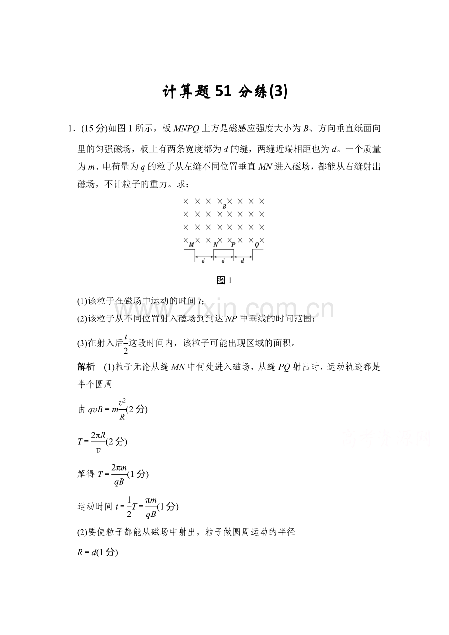1.(15分)如图1所示,板MNPQ上方是磁感应强度大小为B、方向垂直纸面向里的匀强磁场,板上有两条宽度都为d的缝,两缝近端相距也为d。一个质量为m、电荷量为q的粒子从左缝不同位置垂直MN进入磁场,都能从右缝射出磁场,不计粒子的重力。求: