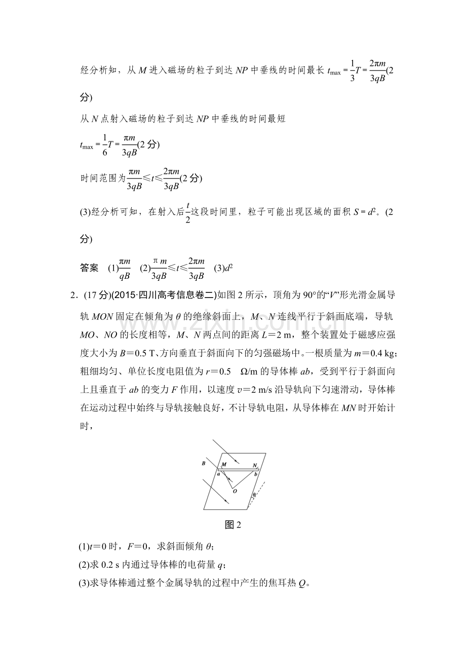 2.(17分)(2015·四川高考信息卷二)如图2所示,顶角为90°的“V”形光滑金属导轨MON固定在倾角为θ的绝缘斜面上,M、N连线平行于斜面底端,导轨MO、NO的长度相等,M、N两点间的距离L=2 m,整个装置处于磁感应强度大小为B=0.5 T、方向垂直于斜面向下的匀强磁场中。一根质量为m=0.4 kg;粗细均匀、单位长度电阻值为r=0.5 Ω/m的导体棒ab,受到平行于斜面向上且垂直于ab的变力F作用,以速度v=2 m/s沿导轨向下匀速滑动,导体棒在运动过程中始终与导轨接触良好,不计导轨电阻,从导体棒在MN时开始计时,