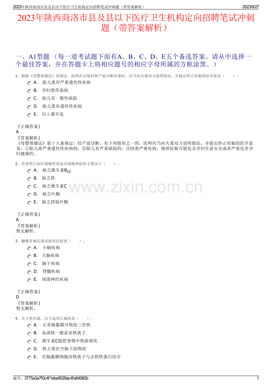 2023年陕西商洛市县及县以下医疗卫生机构定向招聘笔试冲刺题(带答案解析)一、A1型题(每一道考试题下面有A、B、C、D、E五个备选答案。请从中选择一个最佳答案,并在答题卡上将相应题号的相应字母所属的方框涂黑。)1、根据母婴保健法的规定,医师在出现何种产前诊断结果时,应当向夫妻双方说明情况,并提出终止妊娠的医学意见()。A 胎儿患有严重遗传性疾病 B 孕妇患传染病 C 胎儿有一般性缺陷 D 胎儿患有遗传性疾病 E 以上都不是正确答案A答案解析母婴保健法第十八条规定:经产前诊断,有下列情形之一的,医师应当向夫妻双方说明情况,并提出终止妊娠的医学意见:胎儿患严重遗传性疾病的;胎儿有严重缺陷的;因患严重疾病,继续妊娠可能危及孕妇生命安全或者严重危害孕妇健康的。2、营养性巨幼红细胞性贫血出现精神症状主要由于()。A 缺乏维生素B12 B 缺乏铁 C 缺乏维生素C D 缺乏叶酸 E 缺乏四氢叶酸正确答案A答案解析暂无解析。3、腰椎穿刺压颈试验旨在检查()。A 小脑疾病 B 大脑疾病 C 脑干疾病 D 脊髓疾病 E 周围神经疾病正确答案D答案解析暂无解析。4、关于铁代谢,以下选项正确的是()。A 正常肠黏膜可吸收三价铁 B 血清铁一般是亚铁离子 C 维生素C能把食物中铁游离化 D 铁主要在空肠下段吸收 E 在肠黏膜细胞内铁离子与去铁铁蛋白结合2023年陕西商洛市县及县以下医疗卫生机构定向招聘笔试冲刺题(带答案解析)2023/8/27编号:3775a3a7f0c4f1ebe9029ac4fa84062b1正确答案E答案解析正常被吸收入肠黏膜细胞内的铁离子是与去铁铁蛋白结合成铁蛋白,因此E项是正确的。而正常肠黏膜只吸收二价铁,血清铁一般是高铁离子,维生素C是还原剂,可将食物中的三价铁变成二价,铁主要在十二指肠和空肠上段吸收,所以其余各项均不正确。5、通常主要依靠以下哪项来诊断癫痫?()A 脑电图检查 B 脑脊液检查 C 脑CT D 临床表现 E 神经系统体检正确答案D答案解析详细而又准确的病史是癫痫诊断的主要依据,当病人不能诉述发作经过时,需向目睹者仔细了解发作全过程;脑电图检查对癫痫的诊断有很大帮助,约在80%的病人中发现异常,但诊断仍需结合临床现象考虑。6、医师在执业活动中,有下述行为之一的,由县级以上人民政府卫生行政部门给予警告或者责令暂停6个月以上1年以下执业活动,情节严重的,吊销其执业证书,除哪一项外?()A 隐匿、伪造或者擅自销毁医学文书及有关资料的 B 由于不负责任延误急危病重患者的抢救和诊治,造成严重后果的 C 使用未经批准使用的药品、消毒药剂和医疗器械的 D 使用麻醉药品、医疗用毒性药品、精神药品和放射性药品的 E 未经亲自诊查、调查,签署诊断、治疗或者出生、死亡等证明文件的正确答案D答案解析不按规定使用麻醉药品、医疗用毒性药品、精神药品和放射性药品的应受到相应的处罚,在规定范围内可以使用以上药物。7、下列哪一项不是婴儿期的保健重点?()A 保温 B 喂养 C 早教 D 定期体检 E 预防接种正确答案A答案解析婴儿期保健重点是:合理喂养:母乳喂养至少46个月,4个月后逐渐添加辅食,为断奶做准备。预防接种:婴儿期接种五种疫苗.预防七种传染病。早教:训练良好生活习惯,促进感知、心理活动发育。定期体检:监测体格生长发育各项指标。保温已不是婴儿期保健重点。8、下列哪项是5岁小儿按公式计算的身高、体重及头围?()A 116cm,22kg,54cm B 108cm,19kg,51cm C 111cm,20kg,52cm D 114cm,21kg,53cm E 105cm,18kg,50cm正确答案E2023年陕西商洛市县及县以下医疗卫生机构定向招聘笔试冲刺题(带答案解析)2023/8/27编号:3775a3a7f0c4f1ebe9029ac4fa84062b2答案解析暂无解析。9、对于贫血的病理生理基础,下述哪一项是不正确的?()A 红细胞内2,3-DPG含量减少 B ST段压低,T波倒置 C 性功能减退,月经紊乱 D 心脏扩大,脉压加大 E 多尿正确答案A答案解析暂无解析。10、某医师在为患者施行右侧乳房肿瘤摘除术时,发现左侧乳房也有肿瘤,当即进行活检,确诊为乳腺病。医师判断将来可能癌变,未征求患者意见,同时切除了左侧乳房。医师的这种做法,违背了该病人的哪种权利?()A 保密权 B 平等的医疗权 C 隐私权 D 知情同意权 E 获得信息权正确答案D答案解析暂无解析。11、长期饥饿时脑组织的能量主要来源于()。A 脂肪酸氧化 B 酮体氧化 C 葡萄糖氧化 D 氨基酸氧化 E 乳酸氧化正确答案B答案解析暂无解析。12、关于不伤害原则,下列描述正确的是()。A 此原则是绝对的,最基本的 B 临床中存在的很多对病人造成伤害的情况,有些是可以避免的 C 对病人的不伤害,只是指生理上的不伤害 D 对病人的不伤害,是指对病人心理的不伤害 E 如果不伤害原则与其他原则冲突,应该以满足不伤害原则为最终选择正确答案B答案解析不伤害原则不是绝对的,但在医务人员的观念中,应该首先考虑到不能对病人造成伤害,包括生理和心理的伤害。临床中客观存在的很多的对病人造成伤害的情况是可以避免的。故本题答案为B项。13、乙型肝炎病毒的传播途径不包括()。A 输血或器官移植 B 共用牙具2023年陕西商洛市县及县以下医疗卫生机构定向招聘笔试冲刺题(带答案解析)2023/8/27编号:3775a3a7f0c4f1ebe9029ac4fa84062b3 C 性接触 D 呼吸道 E 分娩正确答案D答案解析乙肝病毒主要传染源是患者或无症状携带者,人极易感染,但不通过飞沫传播。14、某医院血库的负责人甲和工作人员乙将不符合国家规定标准