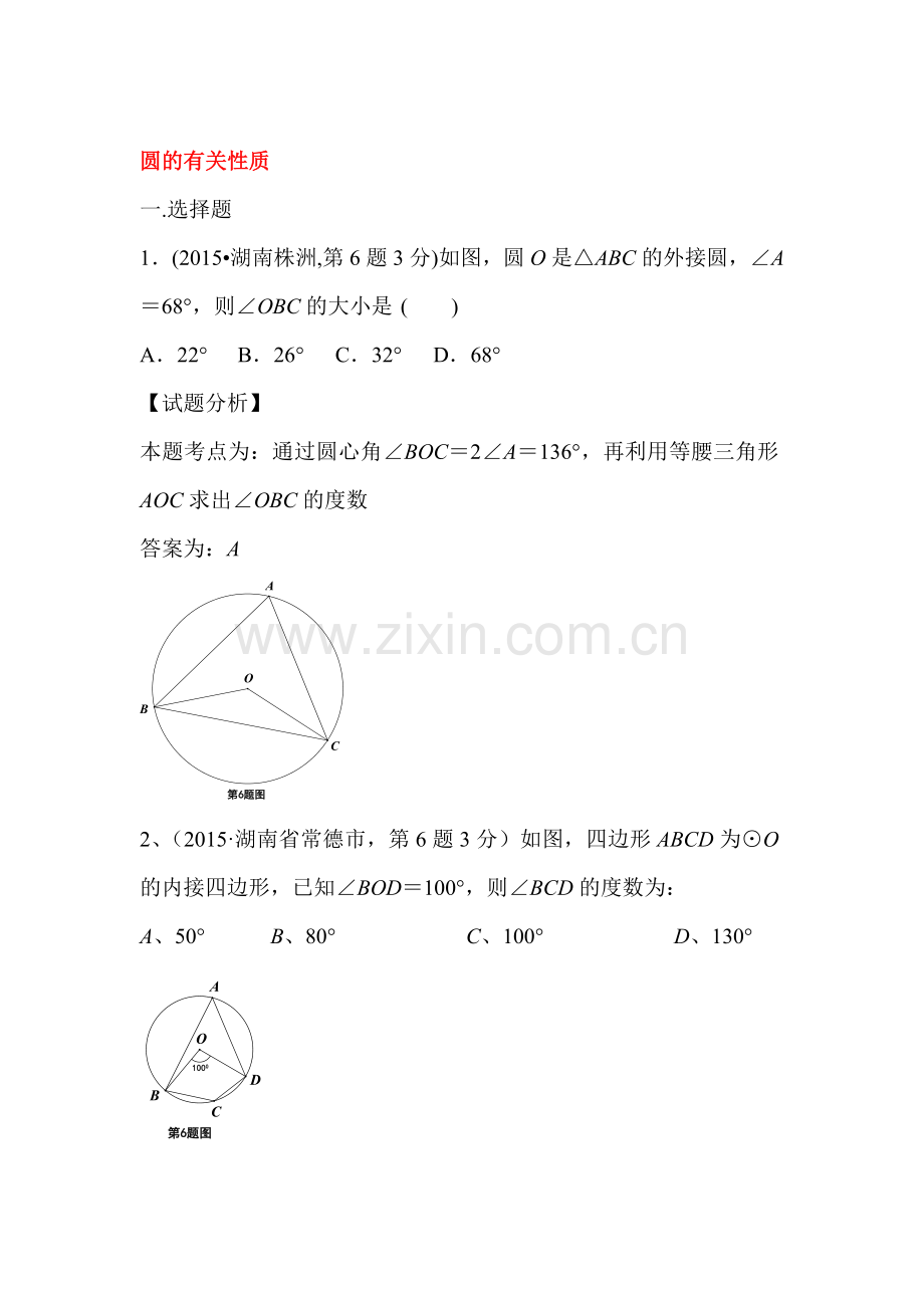 1.(2015•湖南株洲,第6题3分)如图,圆O是△ABC的外接圆,∠A=68°,则∠OBC的大小是 ( )