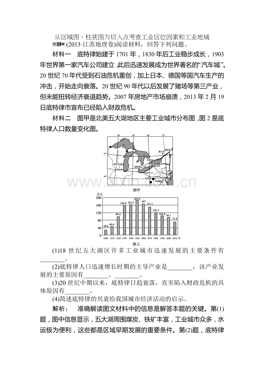 解析: 准确解读图文材料中的信息是解答本题的关键。第(1)题,图中信息显示,五大湖周围煤炭、铁矿丰富,工业城市众多,水运极为便利,这些都是区域早期发展的重要条件。第(2)题,底特律人口迅速增长时期是20世纪初,材料显示正是汽车工业飞速发展的时期。汽车工业在当时属于新技术产业,对技术要求较高,同时也是利用了钢铁工业的基础。第(3)题,注意从材料中获取信息,并结合教材中鲁尔工业区的有关知识作出分析。第(4)题,针对造成美国底特律衰落的因素,结合我国的国情提出相应的措施。