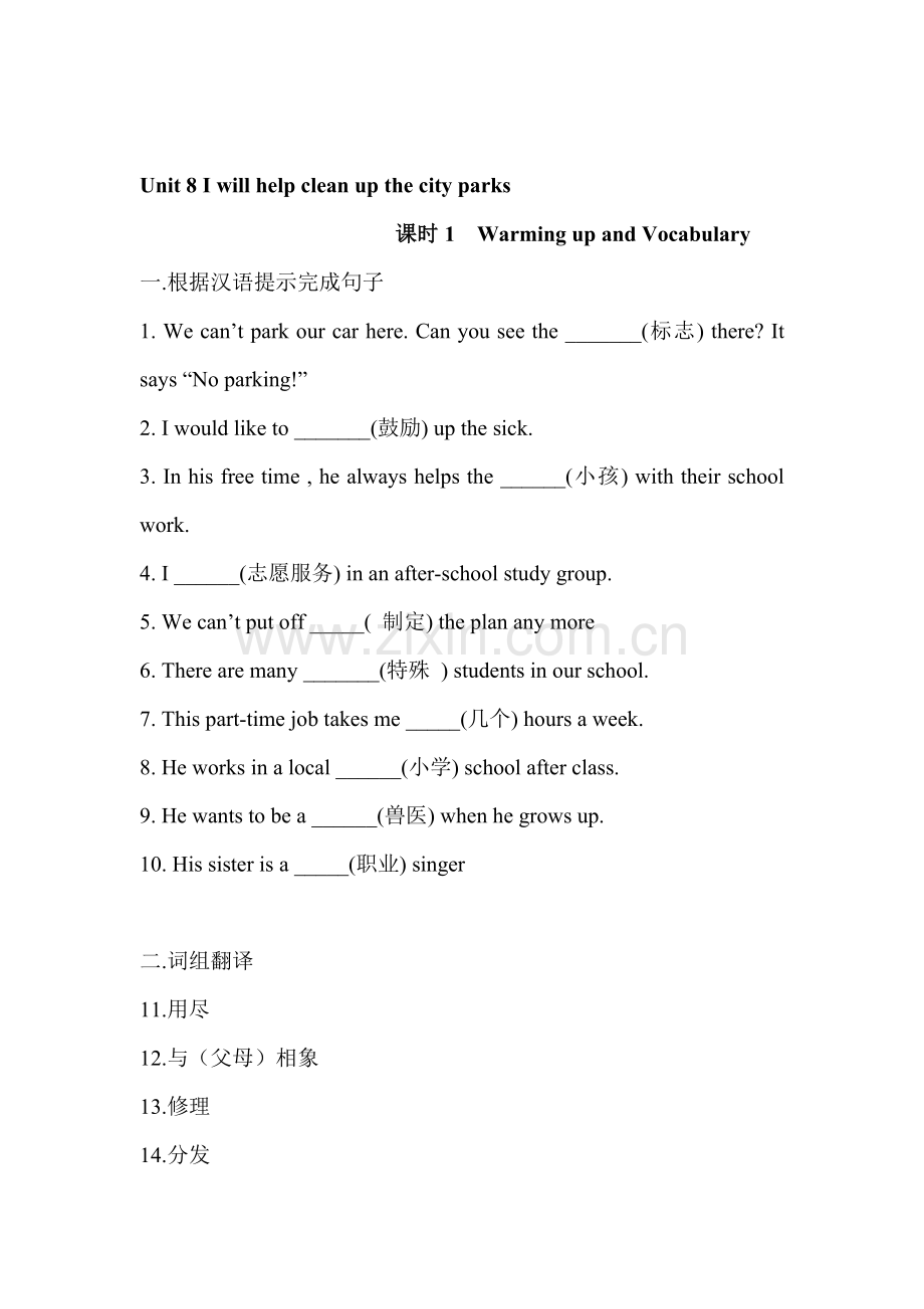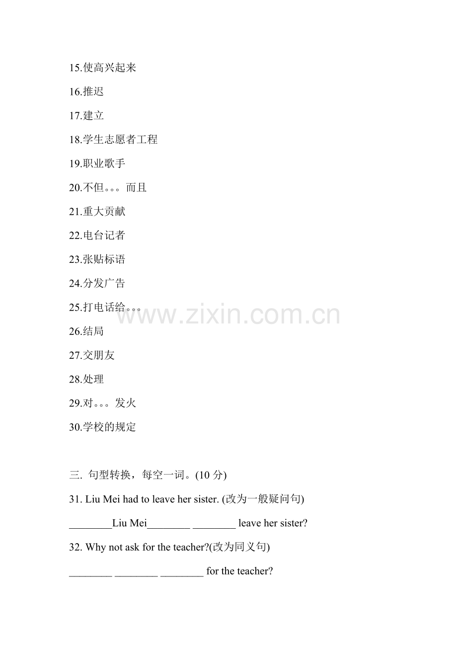 二. 11.run out of, 12.take after, 13.fix up, 14.give away, 15.cheer up, 16.put off, 17.set up, 18.student volunteer project, 19.professional singer, 20.not only…but also 21.a major commitment, 22.a radio interviewer, 23.put up the signs, 24.hand out advertisement, 25.call up, 26.work out, 27.make friends, 28.deal with, 29.be angry with, 30.the rules of school