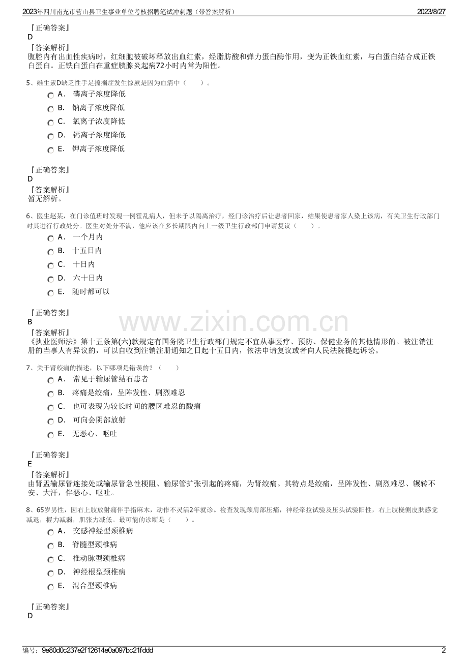 2023年四川南充市营山县卫生事业单位考核招聘笔试冲刺题(带答案解析)一、A1型题(每一道考试题下面有A、B、C、D、E五个备选答案。请从中选择一个最佳答案,并在答题卡上将相应题号的相应字母所属的方框涂黑。)1、比较RNA与DNA的组成,下列正确的是()。A 戊糖相同,部分碱基不同 B 戊糖不同,碱基相同 C 戊糖相同,部分碱基相同 D 戊糖不同,部分碱基不同 E DNA中含有大量的U,RNA中含有大量的T正确答案D答案解析组成RNA的戊糖为核糖,组成DNA的戊糖为脱氧核糖,故戊糖不同;组成RNA的碱基是尿嘧啶,胸腺嘧啶,鸟嘌呤和腺嘌呤,组成DNA的碱基是胞嘧啶,胸腺嘧啶,鸟嘌呤和腺嘌呤,故部分碱基不同。2、枕骨大孔疝疝内容物是()。A 海马钩 B 扣带回 C 脑干 D 小脑扁桃体 E 舌下神经正确答案D答案解析暂无解析。3、属于缺陷病毒的为()。A HBV B HAV C HCV D HDV E HEV正确答案D答案解析暂无解析。4、鉴别急性出血性坏死型胰腺炎与水肿型胰腺炎有价值的实验室检查是()。A 血清淀粉酶 B 血清脂肪酶 C 尿淀粉酶 D 血清正铁白蛋白 E 血清胆红素2023年四川南充市营山县卫生事业单位考核招聘笔试冲刺题(带答案解析)2023/8/27编号:9e80d0c237e2f12614e0a097bc21fddd1正确答案D答案解析腹腔内有出血性疾病时,红细胞被破坏释放出血红素,经脂肪酸和弹力蛋白酶作用,变为正铁血红素,与白蛋白结合成正铁白蛋白。正铁白蛋白在重症胰腺炎起病72小时内常为阳性。5、维生素D缺乏性手足搐搦症发生惊厥是因为血清中()。A 磷离子浓度降低 B 钠离子浓度降低 C 氯离子浓度降低 D 钙离子浓度降低 E 钾离子浓度降低正确答案D答案解析暂无解析。6、医生赵某,在门诊值班时发现一例霍乱病人,但未予以隔离治疗,经门诊治疗后让患者回家,结果使患者家人染上该病,有关卫生行政部门对其进行行政处分。医生对处分不满,他应该在多长期限内向上一级卫生行政部门申请复议()。A 一个月内 B 十五日内 C 十日内 D 六十日内 E 随时都可以正确答案B答案解析执业医师法第十五条第(六)款规定有国务院卫生行政部门规定不宜从事医疗、预防、保健业务的其他情形的。被注销注册的当事人有异议的,可以自收到注销注册通知之日起十五日内,依法申请复议或者向人民法院提起诉讼。7、关于肾绞痛的描述,以下哪项是错误的?()A 常见于输尿管结石患者 B 疼痛是绞痛,呈阵发性、剧烈难忍 C 也可表现为较长时间的腰区难忍的酸痛 D 可向会阴部放射 E 无恶心、呕吐正确答案E答案解析由肾盂输尿管连接处或输尿管急性梗阻、输尿管扩张引起的疼痛,为肾绞痛。其特点是绞痛,呈阵发性、剧烈难忍、辗转不安、大汗,伴恶心、呕吐。8、65岁男性,因右上肢放射痛伴手指麻木,动作不灵活2年就诊。检查发现颈肩部压痛,神经牵拉试验及压头试验阳性,右上肢桡侧皮肤感觉减退,握力减弱,肌张力减低。最可能的诊断是()。A 交感神经型颈椎病 B 脊髓型颈椎病 C 椎动脉型颈椎病 D 神经根型颈椎病 E 混合型颈椎病正确答案D2023年四川南充市营山县卫生事业单位考核招聘笔试冲刺题(带答案解析)2023/8/27编号:9e80d0c237e2f12614e0a097bc21fddd2答案解析颈椎病是指颈椎间盘退行性变,及其继发性椎间关节退行性变所致脊髓、神经、血管损害而出现的相应症状和体征。临床表现以颈肩痛为主,尚可有头、眼、耳、食管、心脏、四肢等部位的症状。神经根型发病率最高,占5060。因颈神经根受压所致。表现为上肢有放射痛和感觉障碍,手指可有麻木、过敏、活动不灵、精细动作困难。体征有颈活动受限;颈肩部压痛;神经牵拉试验、压头试验阳性;神经根所支配区域皮肤感觉改变,早期为疼痛过敏,晚期为减退或消失;肌力减弱,肌肉萎缩,发病初期或急性发作期肌张力增高,慢性期则多表现为肌张力减低,肌肉松弛发软。9、女,38岁,10年前分娩后出现无乳,闭经,食欲减退,怕冷,面色苍白,毛发脱落。诊断最可能是()。A 腺垂体功能减退症 B 原发性甲状腺功能减退症 C 神经性厌食症 D 肾上腺皮质功能减退症 E 卵巢功能早衰症正确答案A答案解析腺垂体功能减退症一般最早出现FSH、LH、PRL不足症群:表现为性征发育不全或退化,性器官萎缩,性功能减退。临床上出现产后无乳,闭经不育,男性阳痿等。TSH不足症群导致继发性甲状腺功能减退。ACTH不足症群可继发肾上腺皮质功能减退。故本题答案为A项。10、急性糜烂出血性胃炎最常见的原因是()。A 不洁饮食 B 剧烈呕吐 C 刺激性食物 D 口服抗生素 E 口服非甾体抗炎药正确答案E答案解析引起急性单纯性胃炎的各种外源性刺激因子尤其是乙醇与非甾体类抗炎药均可破坏胃黏膜屏障,使H及胃蛋白酶逆向弥散入黏膜而导致胃黏膜的急性糜烂。但一些危重疾病,如严重创伤、大面积烧伤、败血症、颅内病变、休克及重要器官的功能衰竭等严重应激状态更是常见的病因。11、小儿咽扁桃体发育达高峰的年龄是()。A 6个月内 B 1岁末 C 23岁 D 34岁 E 410岁正确答案E答案解析小儿扁桃体于1岁时逐渐增大,咽部检查时方可见到,410岁发育达高峰,至1415岁时又逐渐退化。故儿童扁桃体炎常见于学龄儿童。12、某男性糖尿病患者,72岁,腹泻3天,昏迷l天,体温37.3,血压80/60mmHg(10.6/8kPa),皮肤黏膜干燥,血糖40.5mmol/L,尿糖(+),尿酮体(士),该患者最可能的诊断是()。A 糖尿病酮症酸中毒 B 高渗性非酮症性糖尿病昏迷 C 乳酸酸中毒 D 脑血管意外 E 急性胃肠炎202