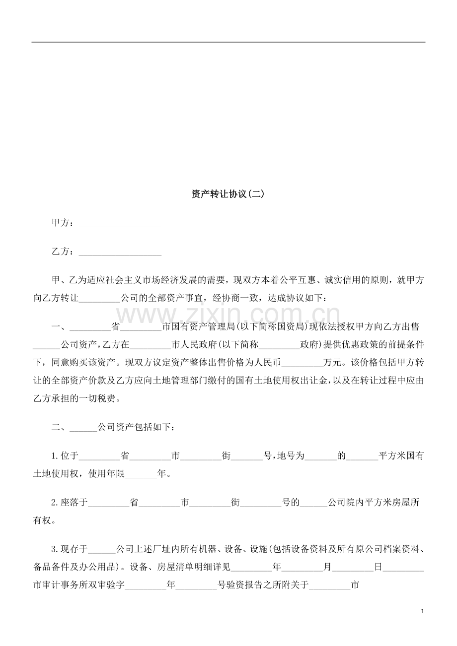 甲、乙为适应社会主义市场经济发展的需要,现双方本着公平互惠、诚实信用的原则,就甲方向乙方转让_________公司的全部资产事宜,经协商一致,达成协议如下: