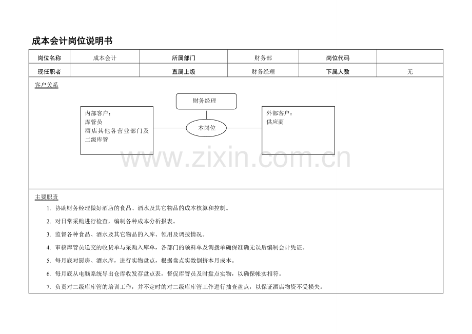 1. 协助财务经理做好酒店的食品、酒水及其它物品的成本核算和控制。