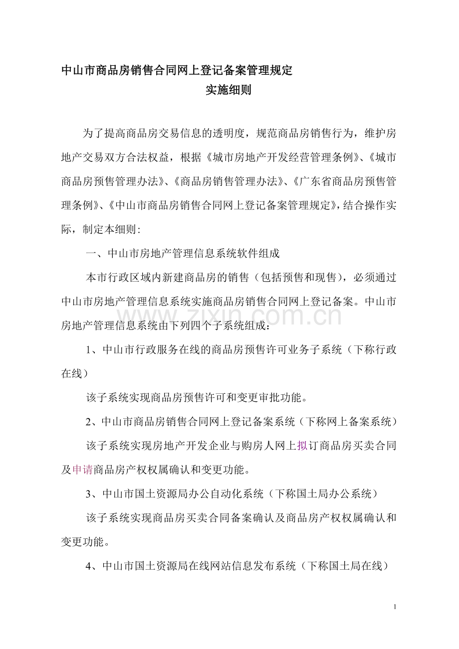 为了提高商品房交易信息的透明度,规范商品房销售行为,维护房地产交易双方合法权益,根据《城市房地产开发经营管理条例》、《城市商品房预售管理办法》、《商品房销售管理办法》、《广东省商品房预售管理条例》、《中山市商品房销售合同网上登记备案管理规定》,结合操作实际,制定本细则: