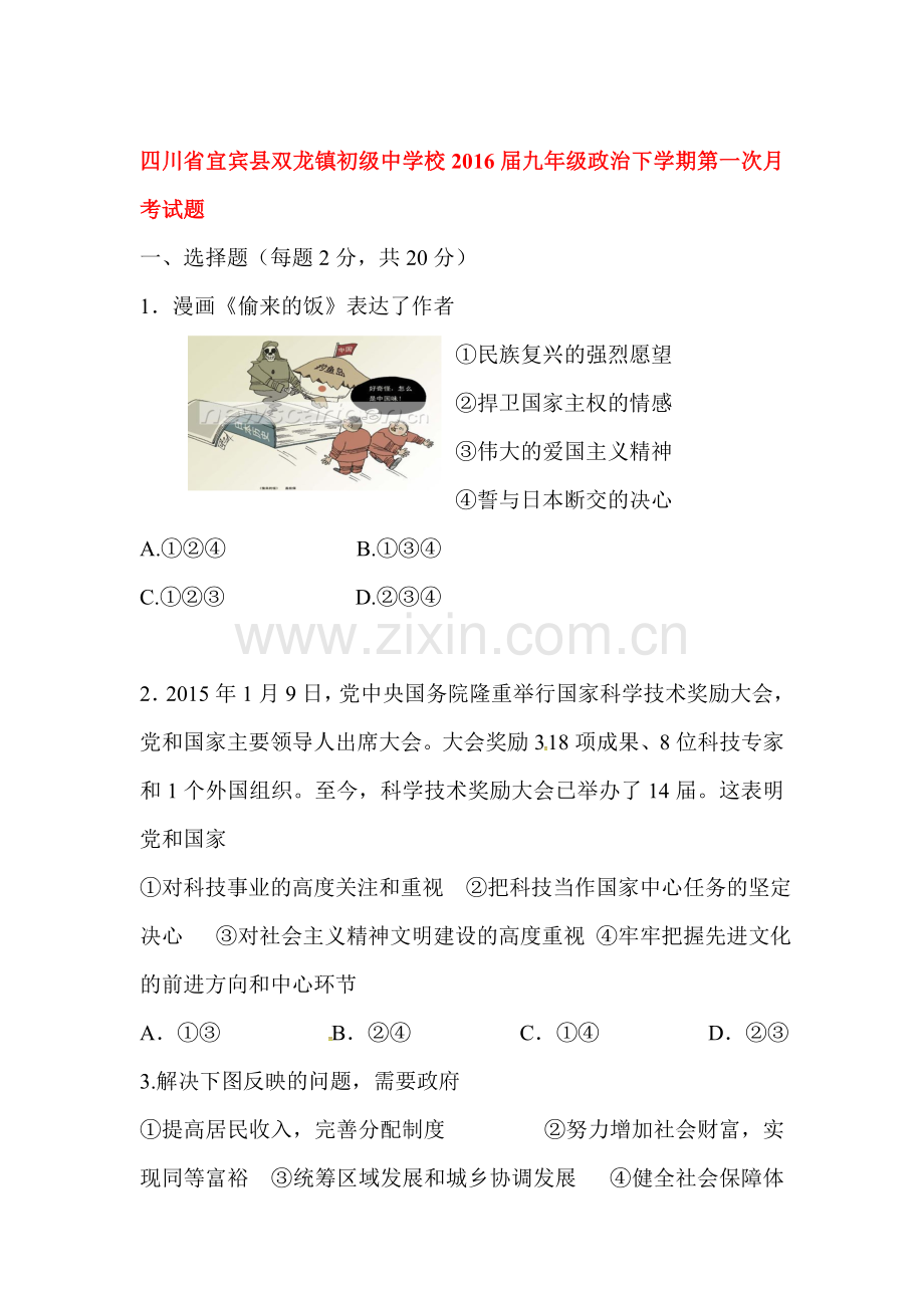 四川省宜宾县双龙镇初级中学校2016届九年级政治下学期第一次月考试题