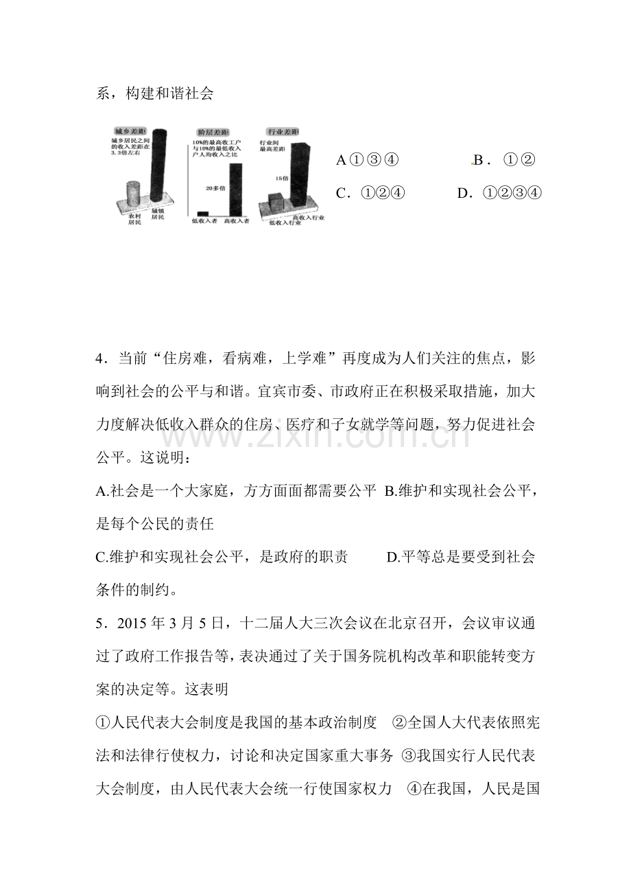 4.当前“住房难,看病难,上学难”再度成为人们关注的焦点,影响到社会的公平与和谐。宜宾市委、市政府正在积极采取措施,加大力度解决低收入群众的住房、医疗和子女就学等问题,努力促进社会公平。这说明: