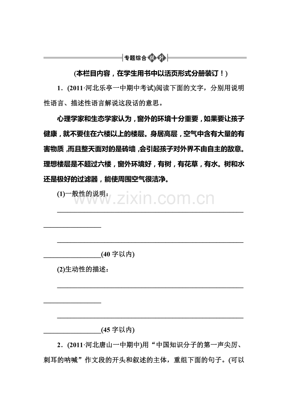 1.(2011·河北乐亭一中期中考试)阅读下面的文字,分别用说明性语言、描述性语言解说这段话的意思。