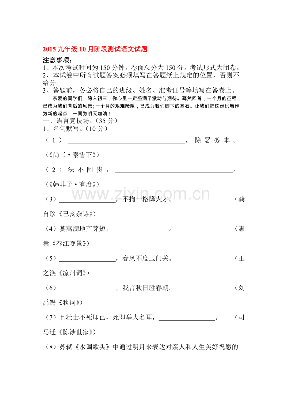 2015九年级10月阶段测试语文试题