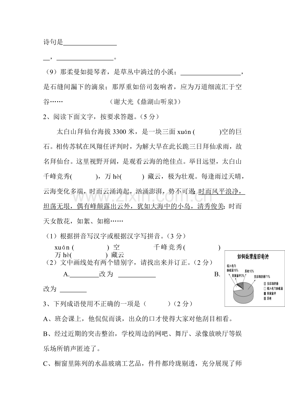 2、 (1)悬 xiù 壑(每空1分) (2)净——静 颠——巅(每空1分)