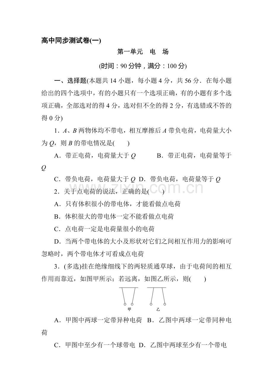 1.[导学号37900001] 【解析】选B.相互摩擦的物体带等量异种电荷,故B带正电,且电荷量等于Q.