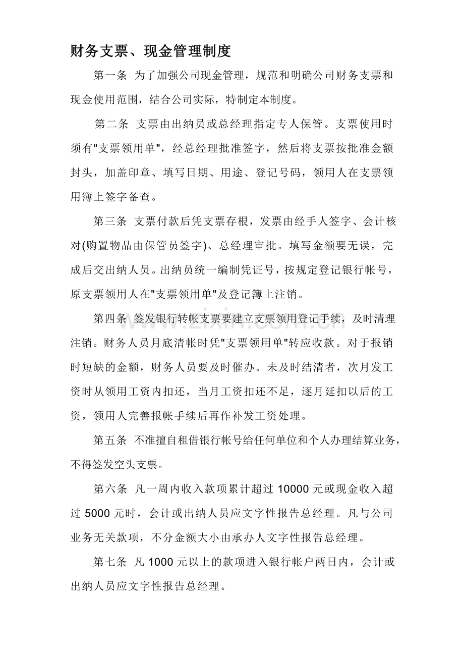 第一条 为了加强公司现金管理,规范和明确公司财务支票和现金使用范围,结合公司实际,特制定本制度。