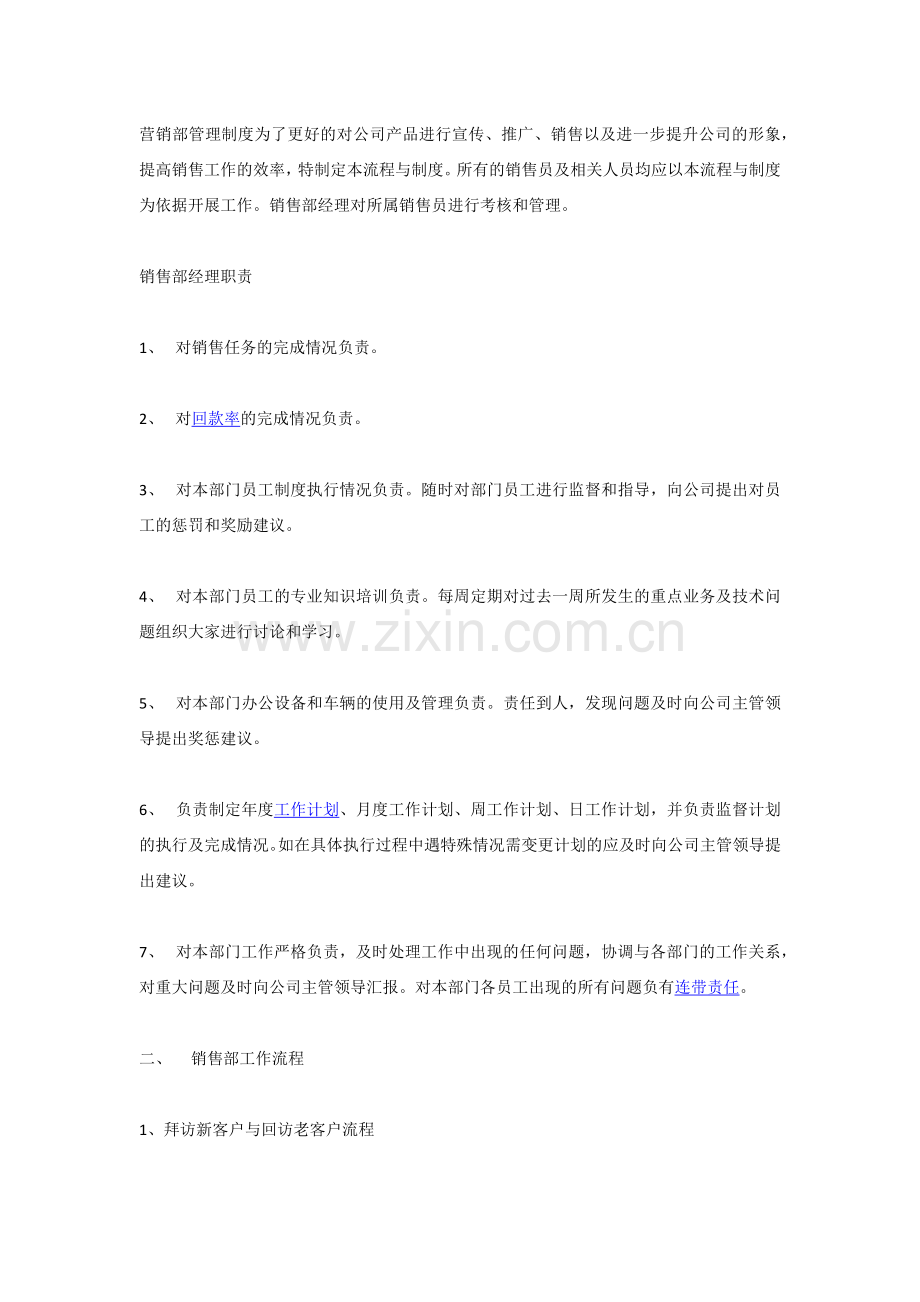 营销部管理制度为了更好的对公司产品进行宣传、推广、销售以及进一步提升公司的形象,提高销售工作的效率,特制定本流程与制度。所有的销售员及相关人员均应以本流程与制度为依据开展工作。销售部经理对所属销售员进行考核和管理。