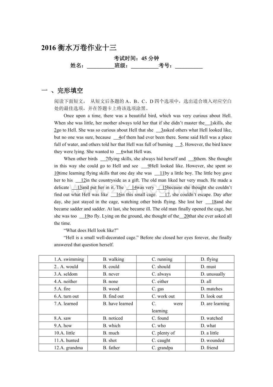 When other birds 7flying skills, she always hid herself and 8them. She thought in this way she could go to Hell and see 9Hell looked like. However, she spent so 10time learning flying skills that one day she was 11by a little boy. The little boy gave her to his 12in the countryside as a gift. The old man liked her very much. He made a delicate 13and put her in it. The 14was very 15because she thought she couldn’t find out what Hell was like 16in this small cage. 17, she couldn’t escape. Day after day, she just stayed in the cage, watching other birds flying. She lost her 18and she became sadder and sadder. At last, she became ill. The old man finally opened the cage, but she was too 19to fly. Lying on the ground, she thought of the 20that she ever asked all the time.
