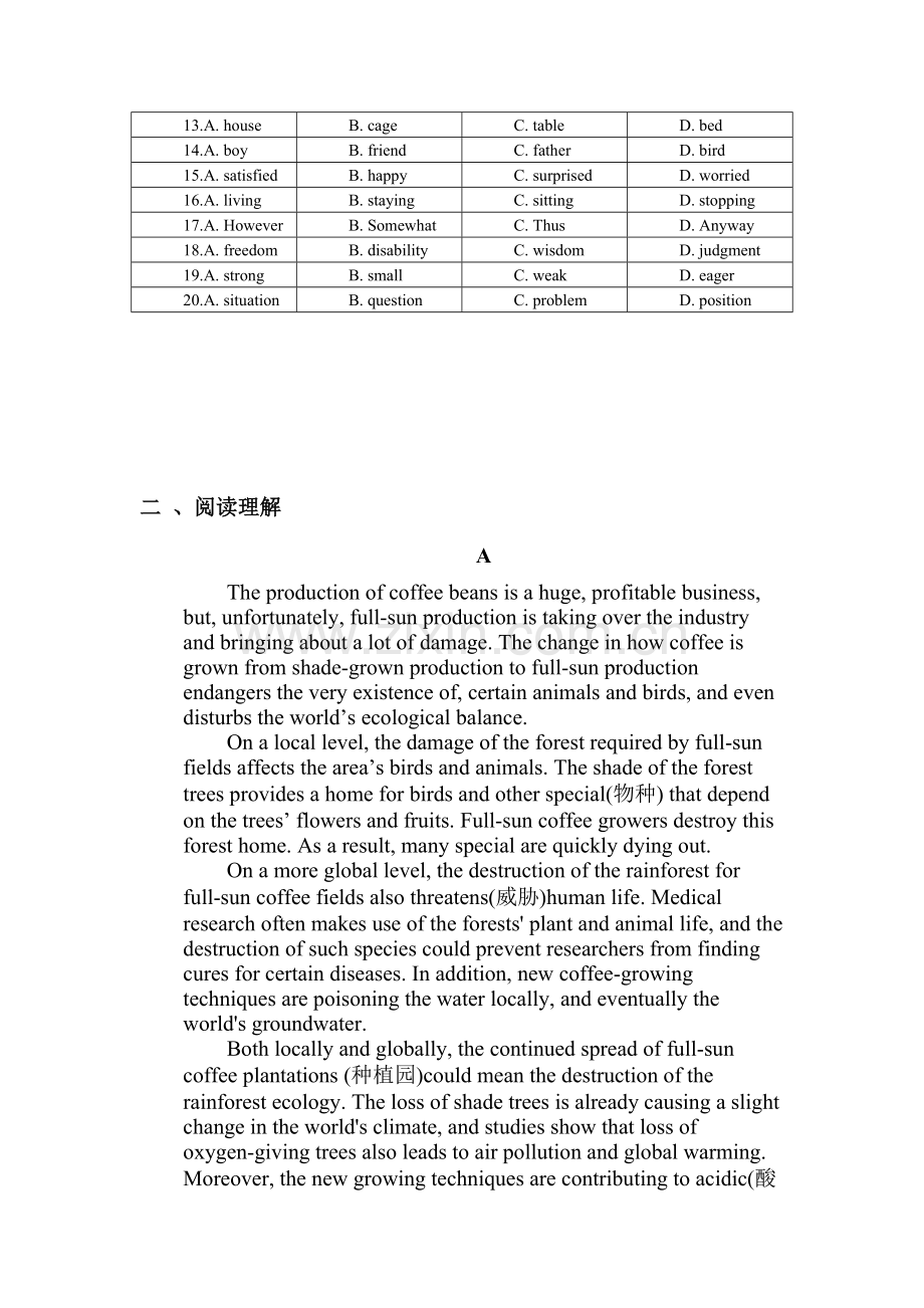 On a local level, the damage of the forest required by full-sun fields affects the area’s birds and animals. The shade of the forest trees provides a home for birds and other special(物种) that depend on the trees’ flowers and fruits. Full-sun coffee growers destroy this forest home. As a result, many special are quickly dying out.