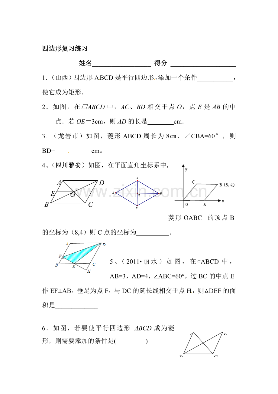 1.(山西)四边形ABCD是平行四边形,添加一个条件___________,使它成为矩形.