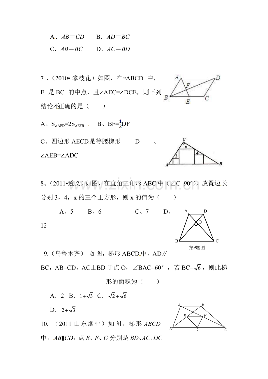 9.(乌鲁木齐) 如图,梯形ABCD中,AD∥BC,AB=CD,AC⊥BD于点O,∠BAC=60°,若BC=,则此梯形的面积为( )