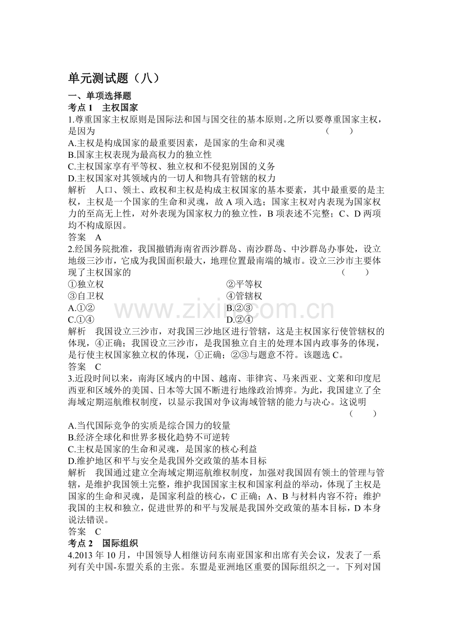 解析 我国设立三沙市,对我国三沙地区进行管辖,这是主权国家行使管辖权的体现,④正确;我国设立三沙市,是我国独立自主的处理本国内政事务的体现,是行使主权国家独立权的体现,①正确;②③与题意不符。该题选C。