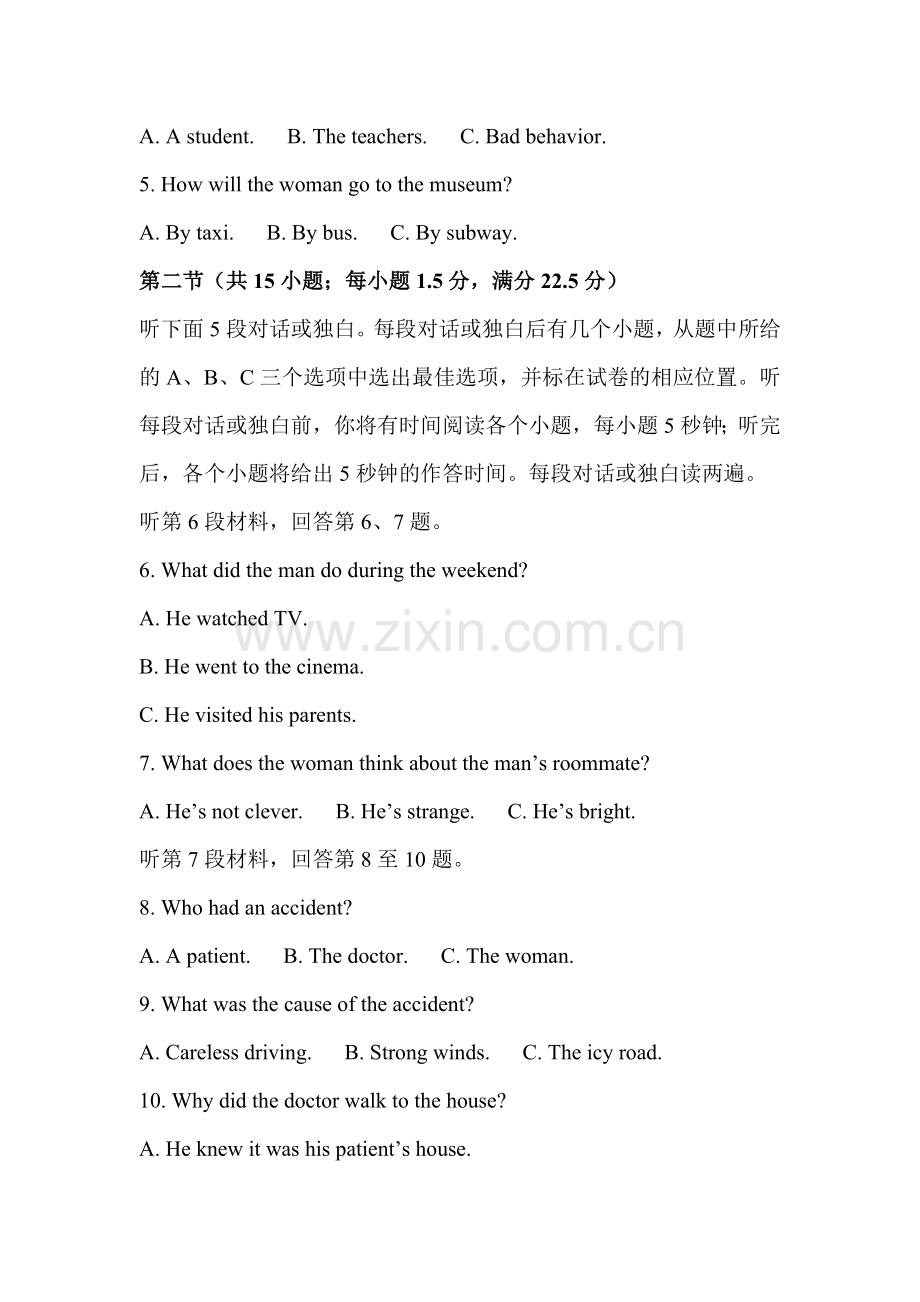听下面5段对话或独白。每段对话或独白后有几个小题,从题中所给的A、B、C三个选项中选出最佳选项,并标在试卷的相应位置。听每段对话或独白前,你将有时间阅读各个小题,每小题5秒钟;听完后,各个小题将给出5秒钟的作答时间。每段对话或独白读两遍。