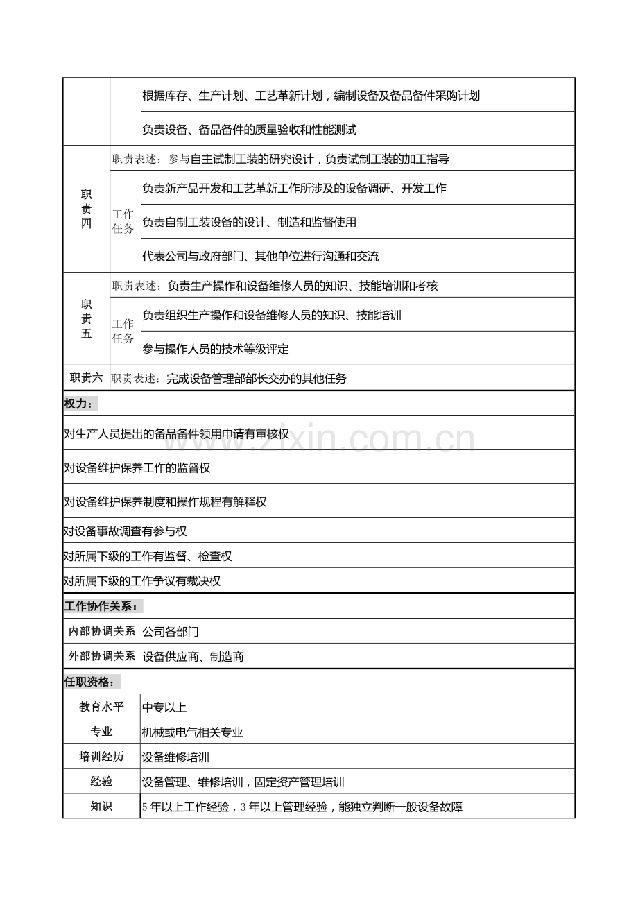 职责表述:负责生产设备的正常运行,协助质量部门维护检验试验设施